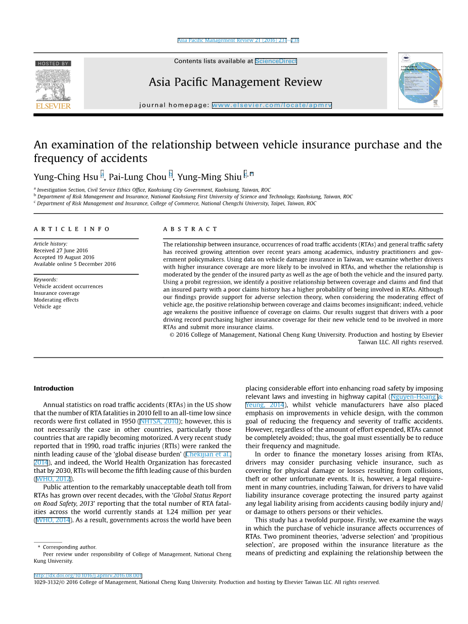 近年来,保险、道路交通事故(RtA)和一般交通安全之间的关系越来越受到学术界、行业从业者和政府决策者的关注。我们利用台湾车辆损坏保险的数据,检验保险覆盖面较高的司机是否更有可能参与区域贸易协定,以及这种关系是否受到被保险方的性别以及车辆和被保险方的年龄的调节。使用概率单位回归,我们确定了保险范围和索赔之间的积极关系,并发现索赔历史不佳的被保险方更有可能参与区域贸易协定。尽管我们的发现为逆向选择理论提供了支持,但当考虑到车辆年龄的调节作用时,保险和索赔之间的正相关关系变得无关紧要;事实上,车辆年龄削弱了保险对索赔的积极影响。我们的结果表明,驾驶记录不佳的司机为他们的新车购买更高的保险,往往会参与更多的区域贸易协定,并提交更多的保险索赔。