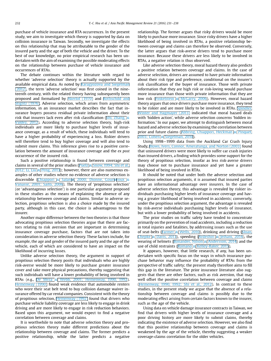 关于“逆向选择”理论是否实际上得到现有经验数据的支持,文献中的争论仍在继续。正如卡拉季佐娃和西格尔曼(2012)所指出的,“逆向选择”一词最早是在十九世纪创造的,相关理论随后由阿克洛夫(1970)和罗斯柴尔德以及斯蒂格利茨(1976)提出并正式化。在保险市场中,由不对称信息引起的逆向选择描述了这样一个事实,即保险购买者拥有关于其风险的剩余私人信息,即使在风险分类之后,保险公司也缺乏这些信息(Shi,Zhang,Valdez,2012)。根据逆向选择理论,高风险个人更有可能购买更高水平的保险,因此,这些个人更有可能遭受损失。因此,风险较高的司机倾向于购买更高的保险,也倾向于提交更多的索赔。这一推论导致保险金额与被保险风险发生后的正相关。