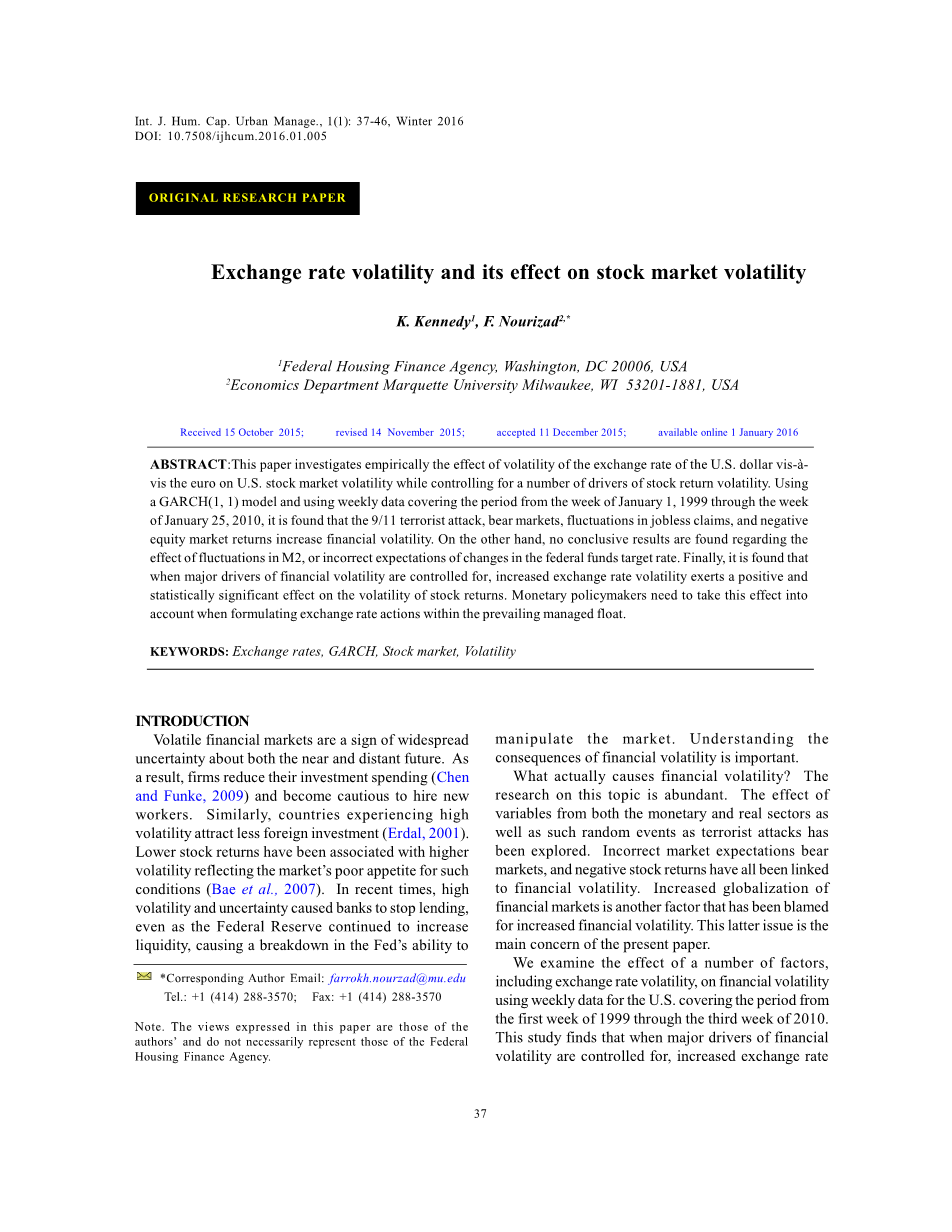 摘要:本文从实证角度研究了美元兑欧元汇率波动性对美国股市波动性的影响,同时控制了一些股票收益波动的驱动因素。使用GARCH(1,1)模型,使用涵盖1999年1月1日至2010年1月25日这一周的每周数据,发现9/11恐怖袭击、熊市、失业救济申请人数波动和负股票市场回报增加了金融波动。另一方面,对于M2波动的影响,或对联邦基金目标利率变化的错误预期,未发现结论性结果。最后发现,当金融波动的主要驱动因素受到控制时,汇率波动性的增加对股票收益的波动性产生了积极的统计显著影响。货币政策制定者在制定现行管理浮动汇率措施时,需要考虑到这一影响。