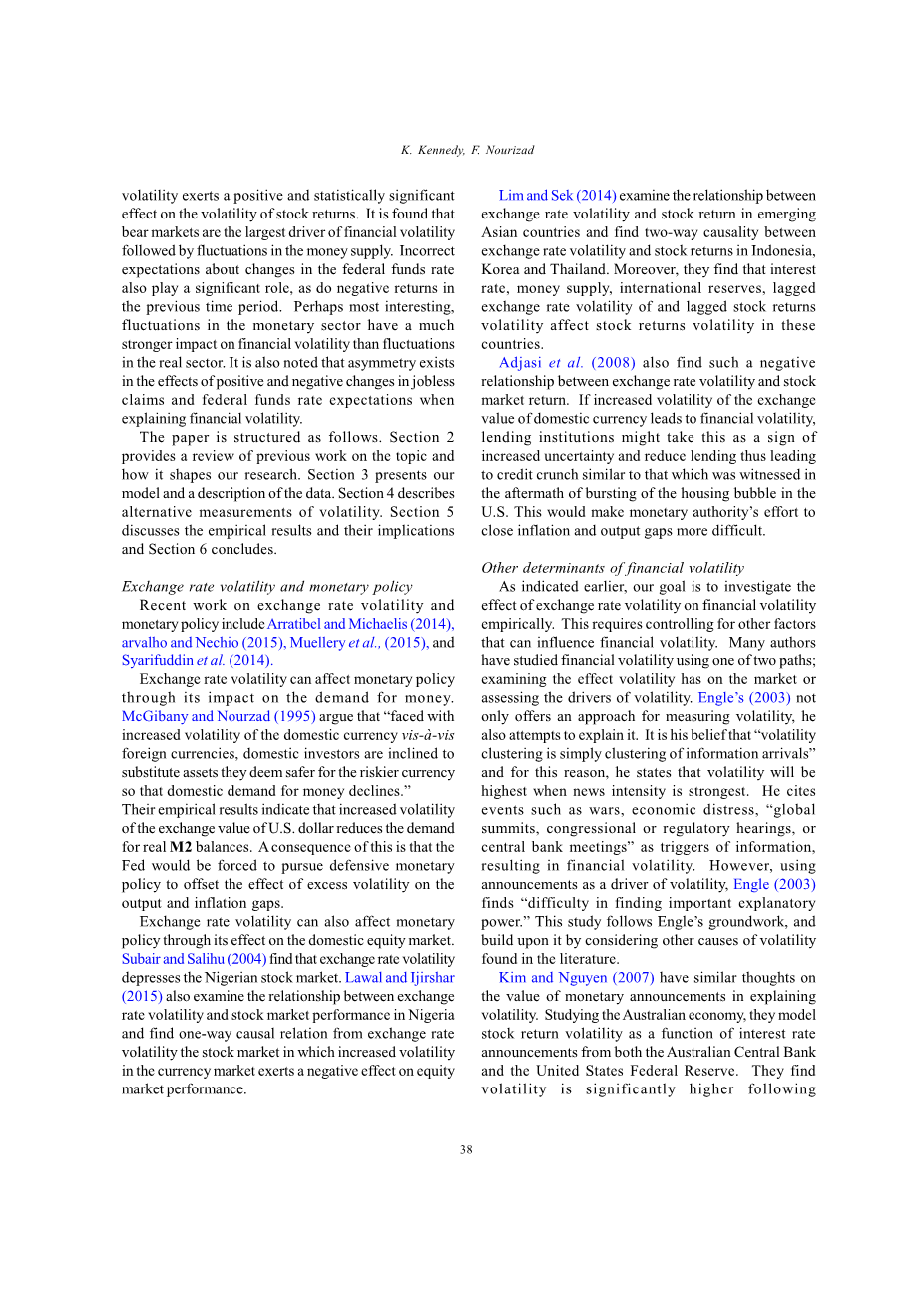 如前所述,我们的目标是从经验上研究汇率波动对金融波动的影响。这需要控制其他可能影响金融波动的因素。许多作者使用两种途径中的一种来研究金融波动;检查波动对市场的影响或评估波动的驱动因素。Engle#39;s(2003)不仅提供了一种测量波动性的方法,他还试图对其进行解释。他认为,“波动性聚类只是信息到达的聚类”,因此,他指出,当新闻强度最强时,波动性最高。他援引战争、经济危机、“全球首脑会议、国会或监管听证会或央行会议”等事件作为信息触发因素,导致金融动荡。然而,使用公告作为波动性的驱动因素,Engle(2003)发现“难以找到重要的解释力”。本研究遵循Engle的基础,并通过考虑文献中发现的其他波动性原因来构建。