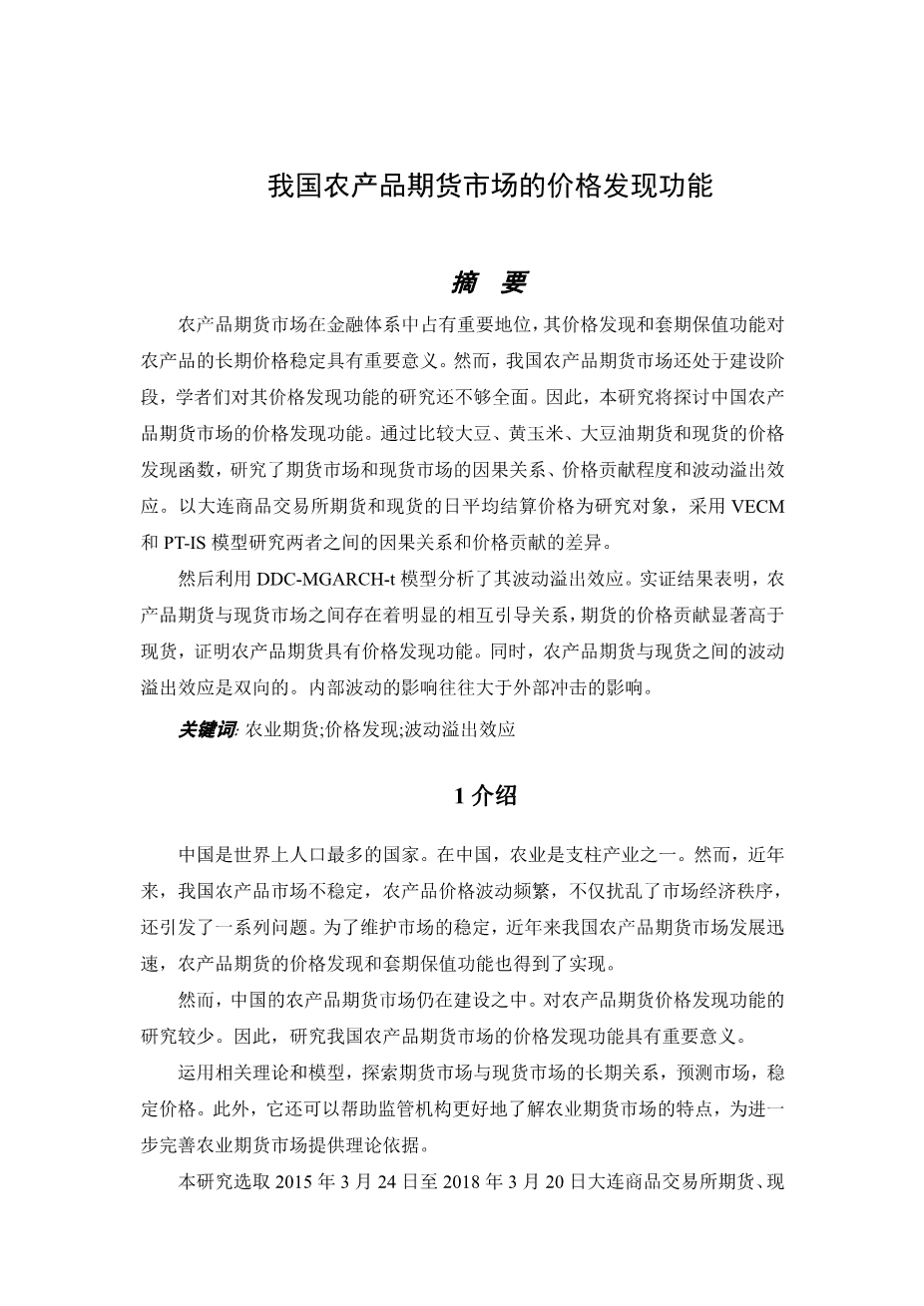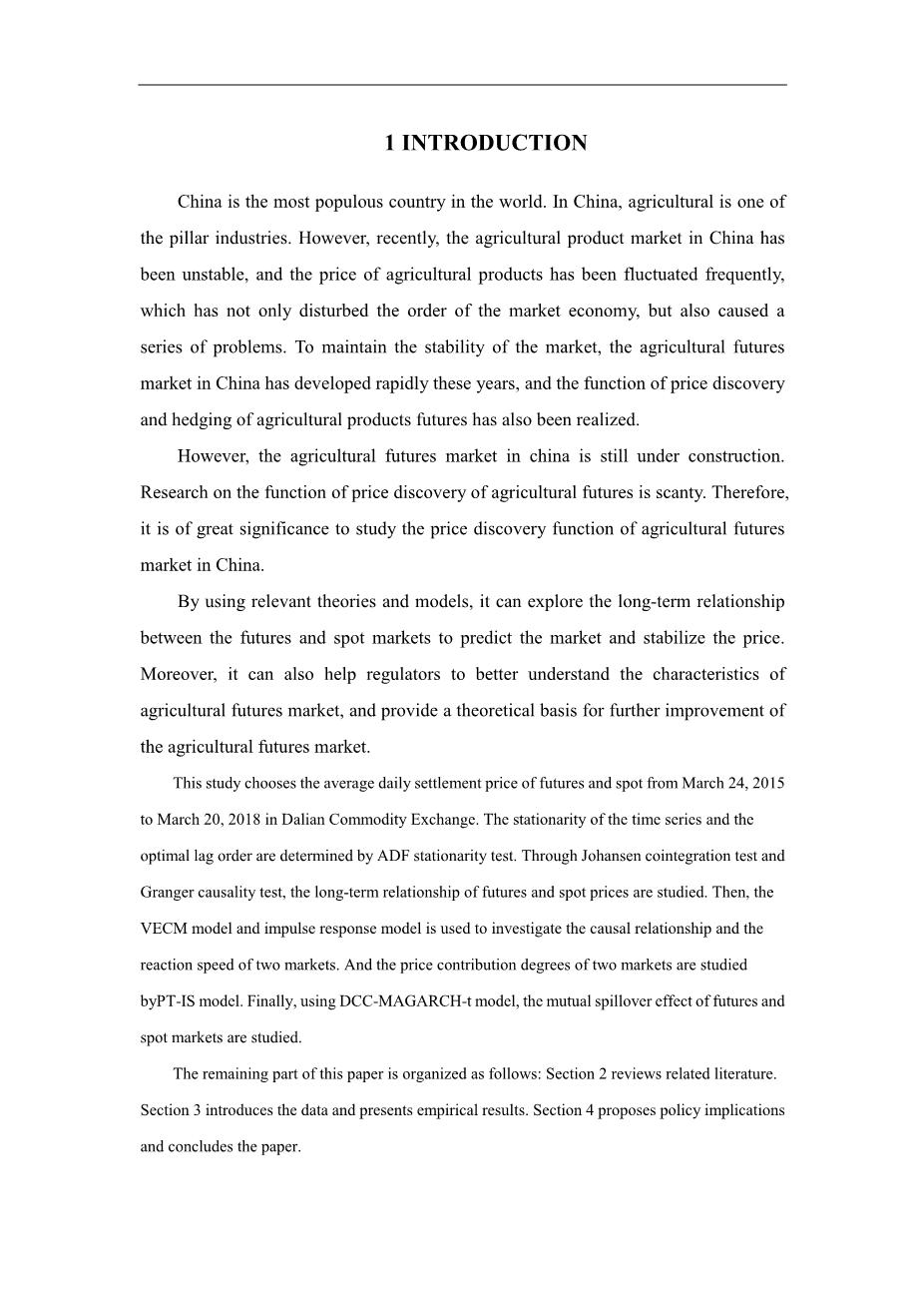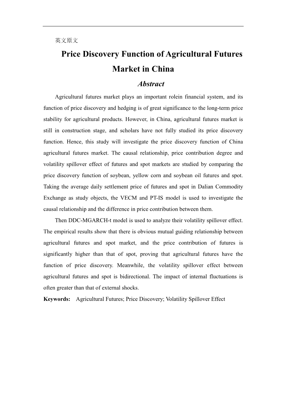 大豆期货市场的价格发现功能及风险控制分析外文翻译资料 2022-02-21 20:47:19 英语原文共 23 页,剩余内容已隐藏,支付完成后下载完整资料 英语译文共 18 页,剩余内容已隐藏,支付完成后下载完整资料资料编号:[445801],资料为PDF文档或Word文档,PDF文档可免费转换为Word 原文和译文剩余内容已隐藏,您需要先支付 30元 才能查看原文和译文全部内容!立即支付 发小红书推广免费获取该资料资格。点击链接进入获取推广文案即可: Ai一键组稿 | 降AI率 | 降重复率 | 论文一键排版 PREVIOUS NEXT 您可能感兴趣的文章 数字普惠金融能否缩小中国城乡收入差距?——区域城乡收入结构透视外文翻译资料 政府补贴和研发投入对中国新能源上市公司财务竞争力影响的实证研究外文翻译资料 商业银行风险管理探讨外文翻译资料 如何应对房地产繁荣:国家经验的教训外文翻译资料 试论时代互联网金融风险的防范外文翻译资料 金融创新与风险共担外文翻译资料 资本和劳动分配结构和中国的经济增长外文翻译资料 绿色金融对中国经济高质量发展的影响研究一一机制与实证分析外文翻译资料 数字经济、普惠金融与包容性增长外文翻译资料 风险投资的绿色化与我国实体产业的绿色创新外文翻译资料