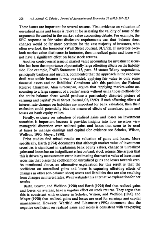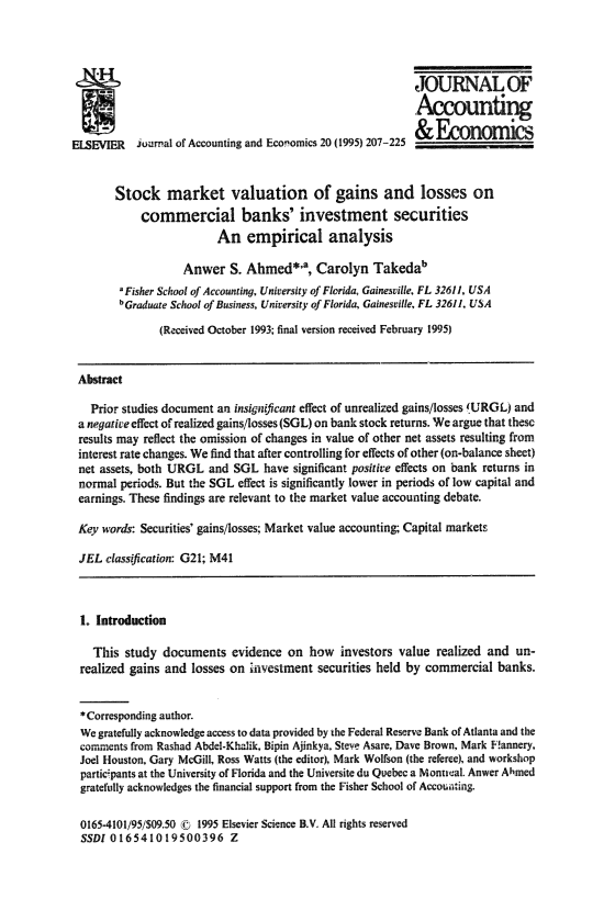 这些问题的重要性有几个原因。首先,有关未实现损益估值的证据与评估市场价值会计辩论中提出的某些论点的有效性有关。例如,美国证券交易委员会对公允价值披露要求的回应是,“资产负债表的变动对绝大多数投资者来说更为切合实际,他们经常忽略脚注”(华尔街日报,1992年1月8日)。如果投资者忽略了脚注中的市场价值披露,那么未实现的损益不会对银行股票收益产生重大影响。