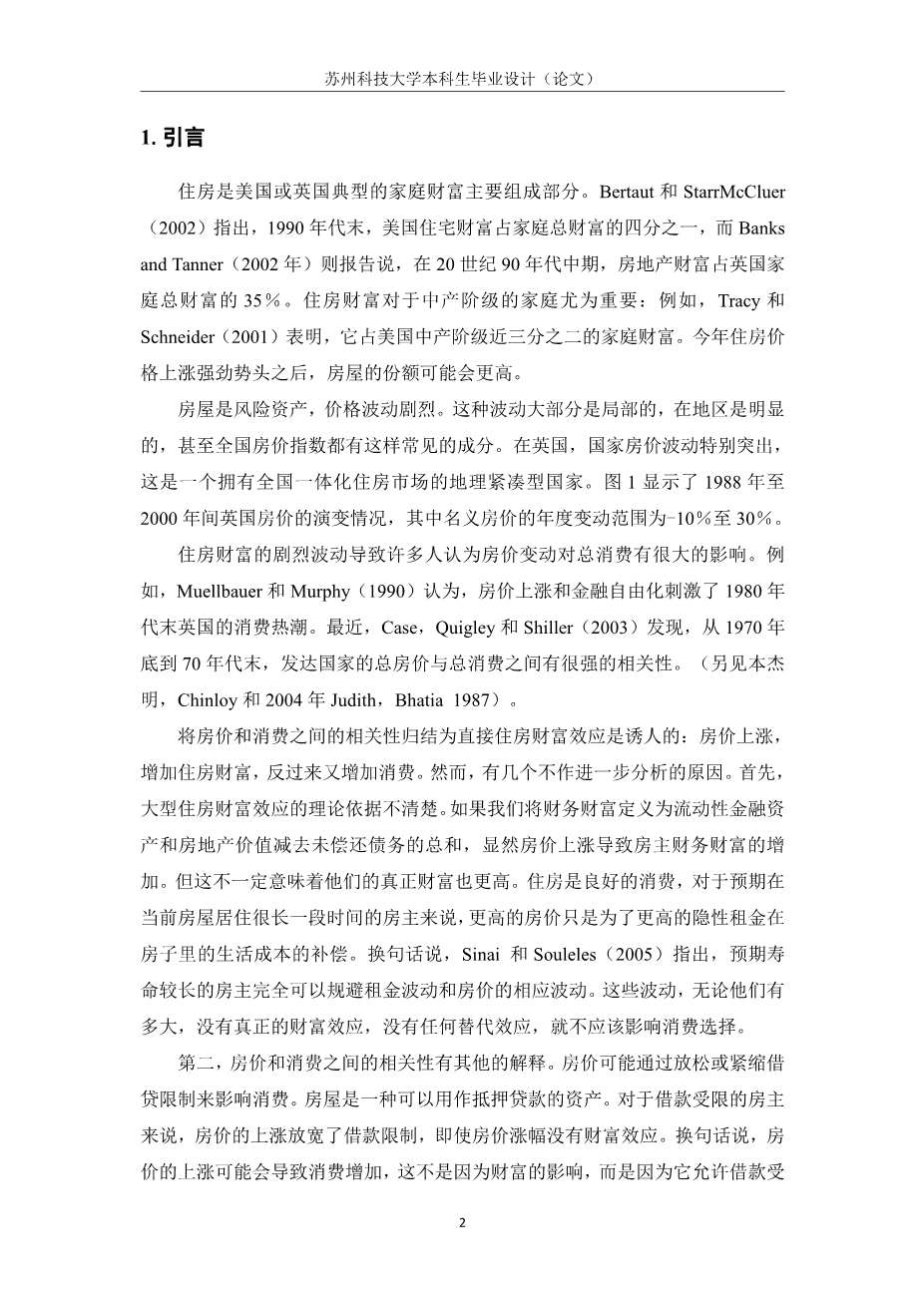 The magnitude and volatility of housing wealth have led many to suggest that house price changes have significant effects on aggregate consumption. Muellbauer and Murphy (1990), forexample, argued that house price increases and financial liberalization stimulated a consumption boom in the UK in the late 1980’s. More recently Case, Quigley, and Shiller (2003) find a strong correlation between aggregate house prices and aggregate consumption in a panel of developed countries from the late 1970’s through the late 1990’s. (Seealso Benjamin, Chinloy, and Jud 2004 and Bhatia 1987).