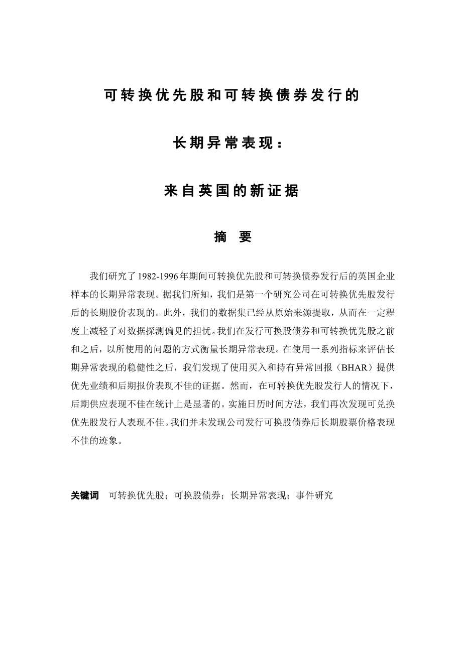 We study the long-run abnormal performance of a sample of U.K. firms following convertible preference share and convertible bond issues over the period 1982–1996. We are the first to study, as far as we are aware, the long- run stock price performance of firms following convertible preference share issues. Furthermore, our data set has been extracted from original sources and thus mitigates to some extent concerns about data-snooping biases. We measure long-run abnormal performances both prior to and following the issuance of convertible bonds and convertible preference shares and by the method of the issue used. Using a range of metrics to assess the robustness of long-run abnormal performance, we find evidence of pre-offer overperformance and post-offer underperformance using buy-and-hold abnormal returns (BHARs). However, post-offer underperformance is statistically significant in the case of convertible preference share issuers. Implementing a calendar-time approach, we again find underperformance for convertible preference share issuers. We do not find any evidence of long-run stock price underperformance for firms following the issuance of convertible bonds.