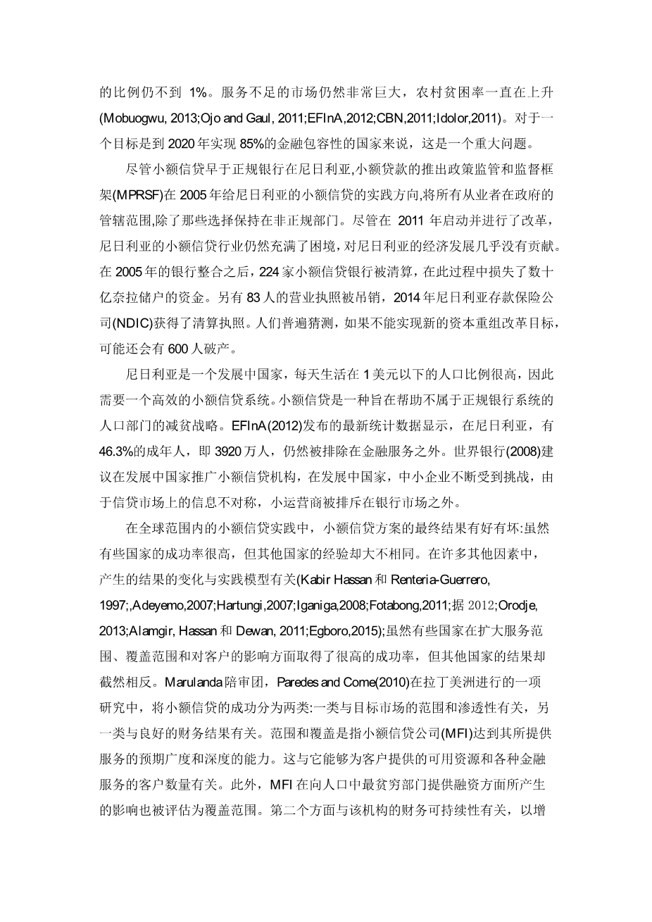 Nigeria, being a developing country with a high percentage of people living on less than $1 per day, needs an efficient microfinance system. Microfinancing is a poverty reduction strategy targeted at reaching a sector of the population that is excluded from the formal banking system. Recent statistics released by EFInA (2012) show that 46.3% of Nigerian adults, representing 39.2 million people, are still excluded from financial services. The World Bank (2008) recommends the promotion of microfinance institutions in developing countries, where small- and medium-scale businesses are constantly challenged and small operators are shut out of the banking market due to information asymmetry in the credit market.