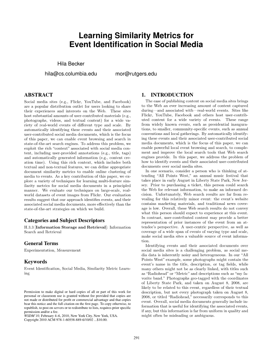 通过社交媒体网站识别事件及其相关文档是一个具有挑战性的问题,因为社交媒体数据本质上是嘈杂和异构的。 在我们的“All Points West”示例中,某些照片可能在标题,说明或标记域中包含事件名称,而其他许多照片可能没有如“Radiohead”或“Metric”等标题以及描述 作为“我最喜欢的乐队”。带有Liberty State Park坐标的地理标签,2008年8月8日拍摄的照片可能与此事件有关,无论其文字描述,但不是2008年8月8日拍摄的每张照片或标题为“Radiohead”的照片都必定与此事件相对应。 总的来说,社交媒体文件通常包含对识别相关事件有用的信息(如果有的话),但是这些信息的质量远不一致,并且可能通常具有误导性或含糊不清。