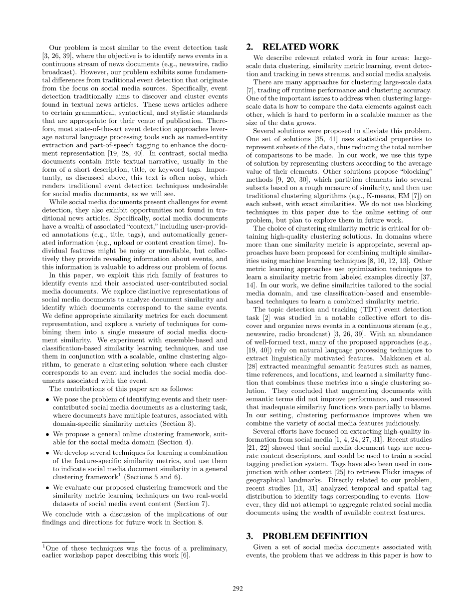 1. 我们提出识别事件及其用户贡献的社交媒体文档作为聚类任务的问题,其中文档具有多个特征,与特定于领域的相似性度量相关联(第3章节)