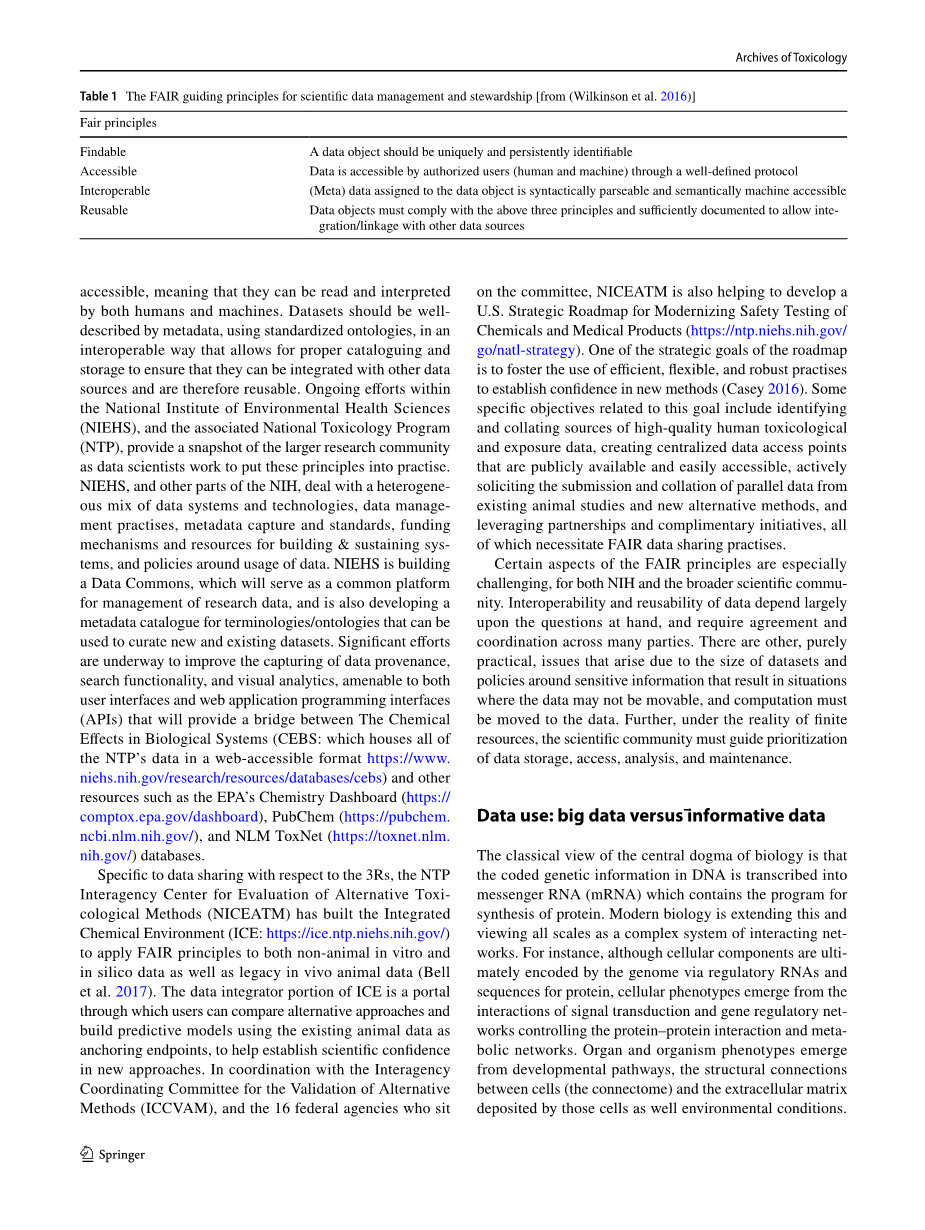 这样的一个倡议导致了用于科学数据和工作管理的FAIR原则(表1)的出版(Wilkinson 等人作于2016)。这四个原则已经成为包括健康研究所(NIH)以及更广泛的科学研究社区在内的国家数据实践的主要目标。 对于NIH,其数据对象是联邦存储的,在内部和外部数据都必须经由如数字对象标识符(DOI)才可以被发现和访问,这意味着它们可以同时被人和机器所读取和翻译。数据集应该用元数据来描述,使用标准化的本体论可互操作的方式,允许适当的编目和存储以确保它们可以与其他数据集成来源,因此可以重复使用。国家环境卫生科学研究所(IEHS)和相关的国家毒理学计划(NTP)正在进行不断的努力,随着数据科学家正努力将这些原则付诸实践,他们提供了大型研究社区的一种快速缩影。NIEHS和NIH的其他部门旨在处理数据系统和技术,数据管理实践,元数据捕获和标准,资金建立和维持系统的机制和资源,以及围绕数据使用的政策等问题。 NIEHS正在建设中一个Data Commons,它将作为一个通用平台用于管理研究数据,并且正在开发一个用于策划新的和现有的数据集术语/本体的元数据目录。对数据来源​​的捕获,搜索功能和可视化分析,可以同时使用用户界面和Web应用程序编程接口(APIs)的研究正进行巨大的努力。该接口将提供生物系统的化学作用CEBS(包含所有生物系统NTP的数据以网页访问格式https://www.