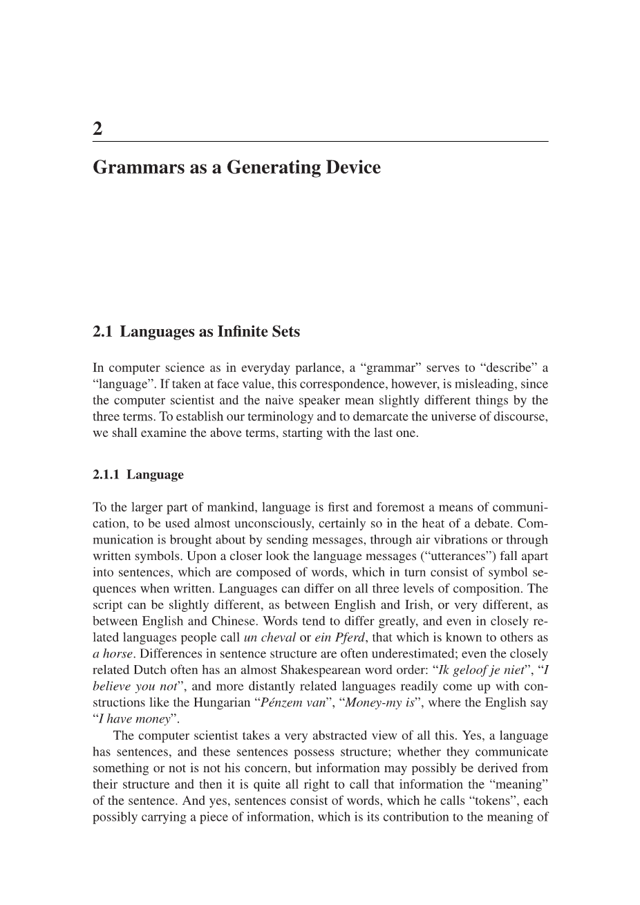 对于大部分人来说,语言首先是一种交流方式,几乎无意识地使用语言,当然在激烈的辩论中也是如此。交流是通过空气振动或通过文字符号携带信息来实现。仔细观察,语言信息会分解成句子,这些句子由单词组成,而单词在书写时又由符号序列组成。语言在所有三个构成层面上都可以不同。字母可能略有不同,如英语和爱尔兰语,或者非常不同,如英语和汉语。语言往往差别很大,甚至在人们熟知的语言中,人们将马称为“un cheval”或“ein Pferd”。句子结构的差异经常被低估。即使是紧密相关的荷兰人,也经常有一种近乎莎士比亚式地语句:“lk geloof je niet”,“i believe you not”,而更多相关的语言很容易找到像匈牙利语“Penzem van”,“money-my is”的结构,而英语中则是“I have money”。