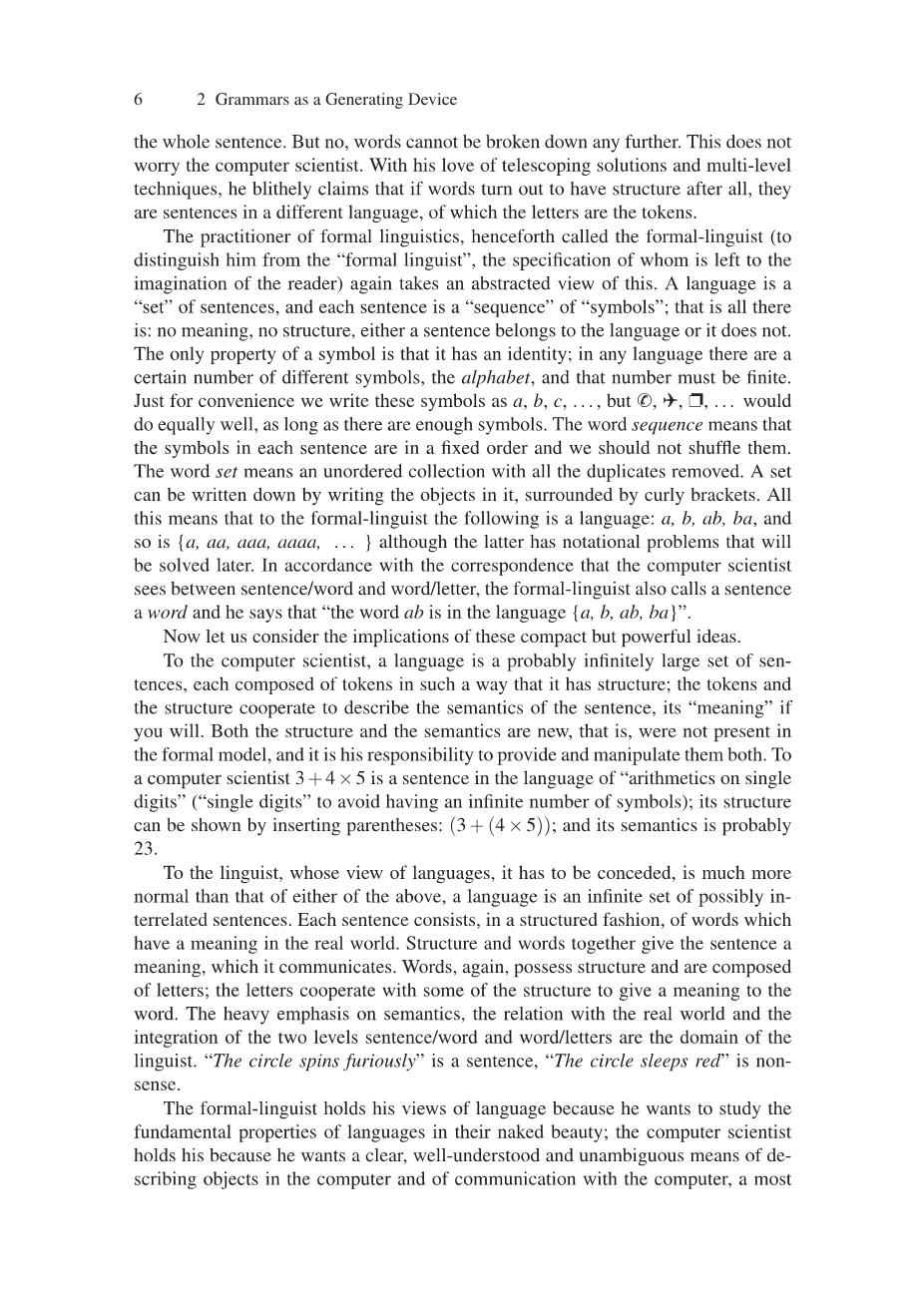 形式语言学家持有他对语言的看法,因为他想要研究语言最基本的属性。计算机科学家坚持他的观点,因为他想要一个清晰的、透彻的、明确的方法来描述计算机中的物体以及计算机间的通信,这是一个与人类不同的通信伙伴。语言学家持有他对语言的看法,因为它给了他一个严格控制的看似混乱但也无限复杂的对象:自然语言。