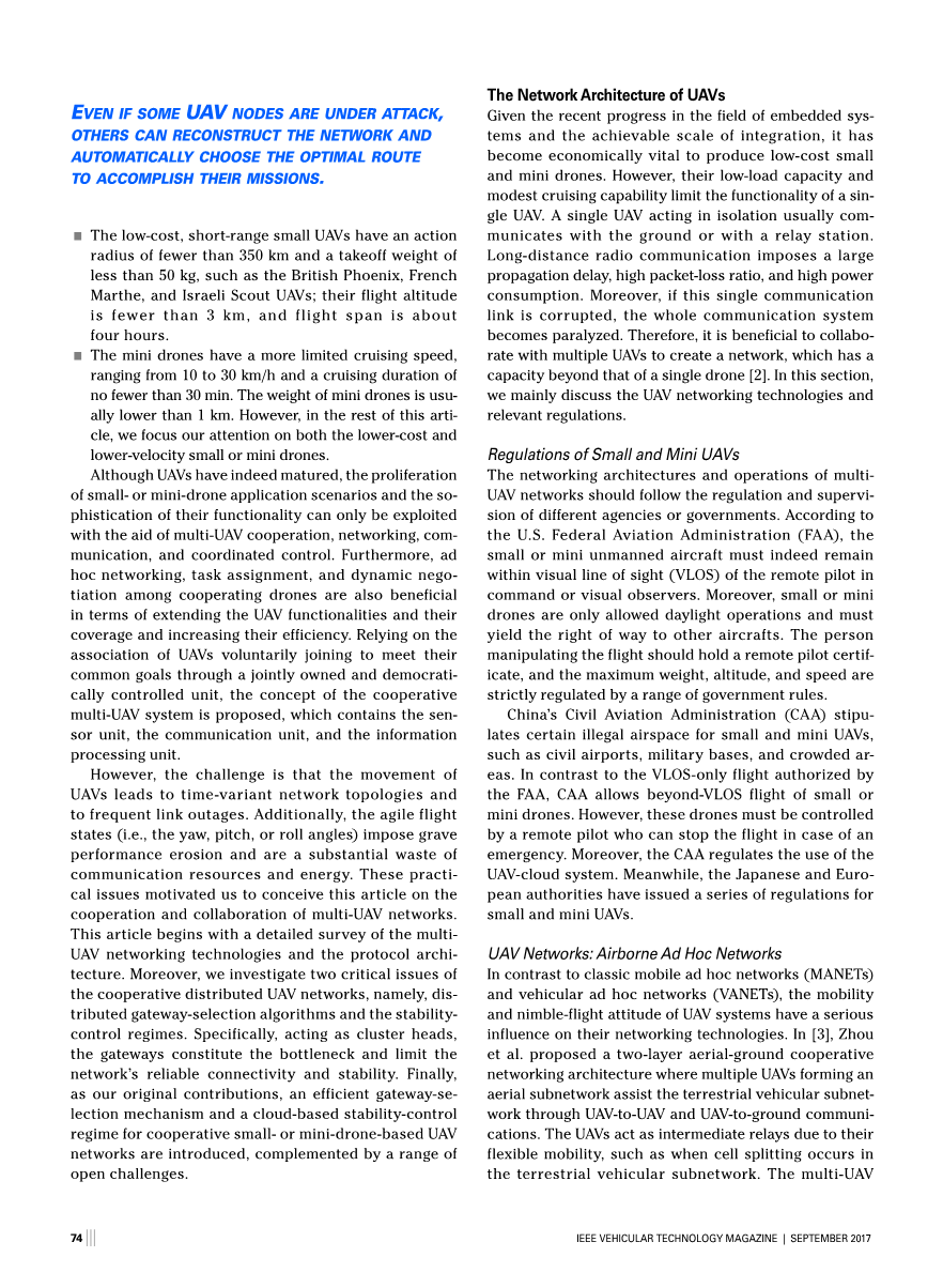 考虑到嵌入式系统领域最近的进展和可实现的集成规模,生产低成本的小型和微型无人机对经济至关重要。然而,它们的低负荷能力和适度巡航能力限制了单个无人机的功能。单独的一架无人机通常与地面或中转站进行通讯。远距离无线电通信具有较大的传播延迟、高丢包率和高功率消耗。此外,如果这个单一的通信链路被破坏,整个通信系统就会瘫痪。因此,多架无人机合作创造一个网络,这是很有好处的,它的容量超过了单个无人机的能力。在本节中,我们主要讨论无人机网络技术和相关规定。