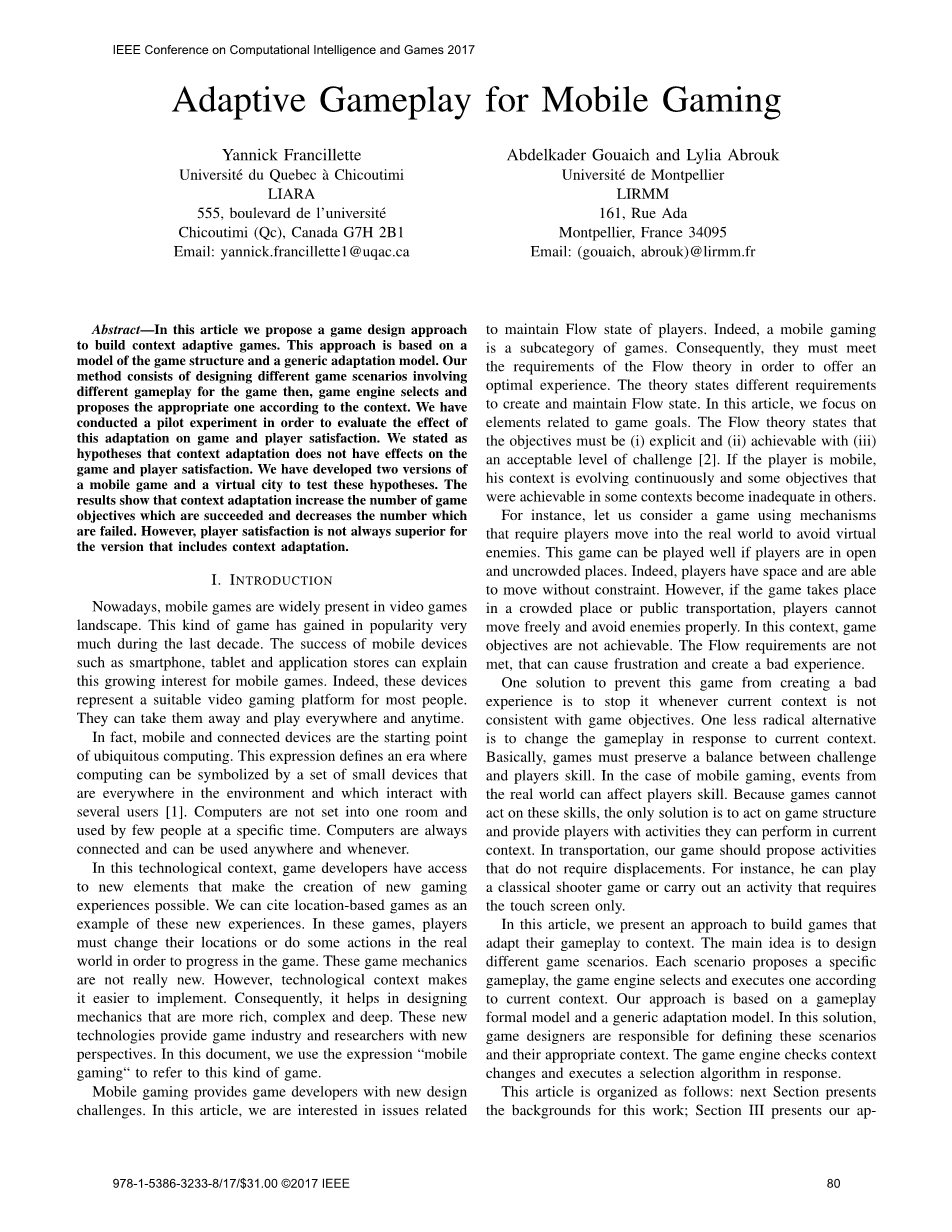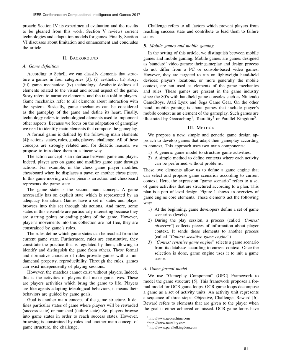 摘要 - 在本篇文章中,我们提出了一种用于构建背景自适应游戏的游戏设计方法。 这种方法基于游戏结构模型和通用适应模型。 我们的方法包括设计不同的游戏场景,其中涉及游戏的不同玩法,然后游戏引擎根据上下文选择并提出适当的游戏场景。为了评估这种适应对游戏和玩家满意度的影响,我们进行了一个试验性实验。我们假设情境适应对游戏和玩家满意度没有影响,并且开发了两款手机游戏和一个虚拟城市来测试这些假设。 结果表明,情境适应增加了成功的游戏目标数量,减少了失败的数量。 然而,对于包含情景自适应的游戏版本,玩家满意度并不总是优于其他版本。