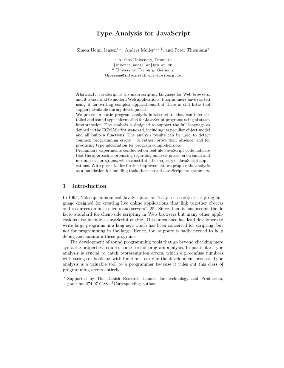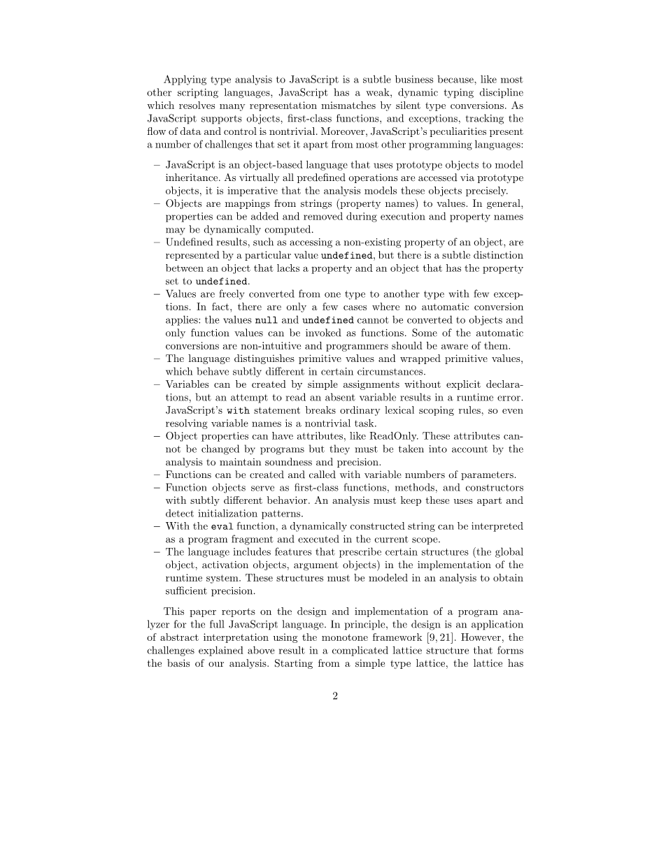 这项工作是迈向成熟的JavaScript程序分析器的第一步,该分析器可以集成到IDE中,以提供即时错误检测以及支持自动完成和文档提示。它着重于JavaScript版本1.5,与ECMAScript第3版[11]相对应,该版本是目前使用最广泛的该语言版本,并且是即将到来的JavaScript语言版本的子集。总之,本文的贡献是下列: