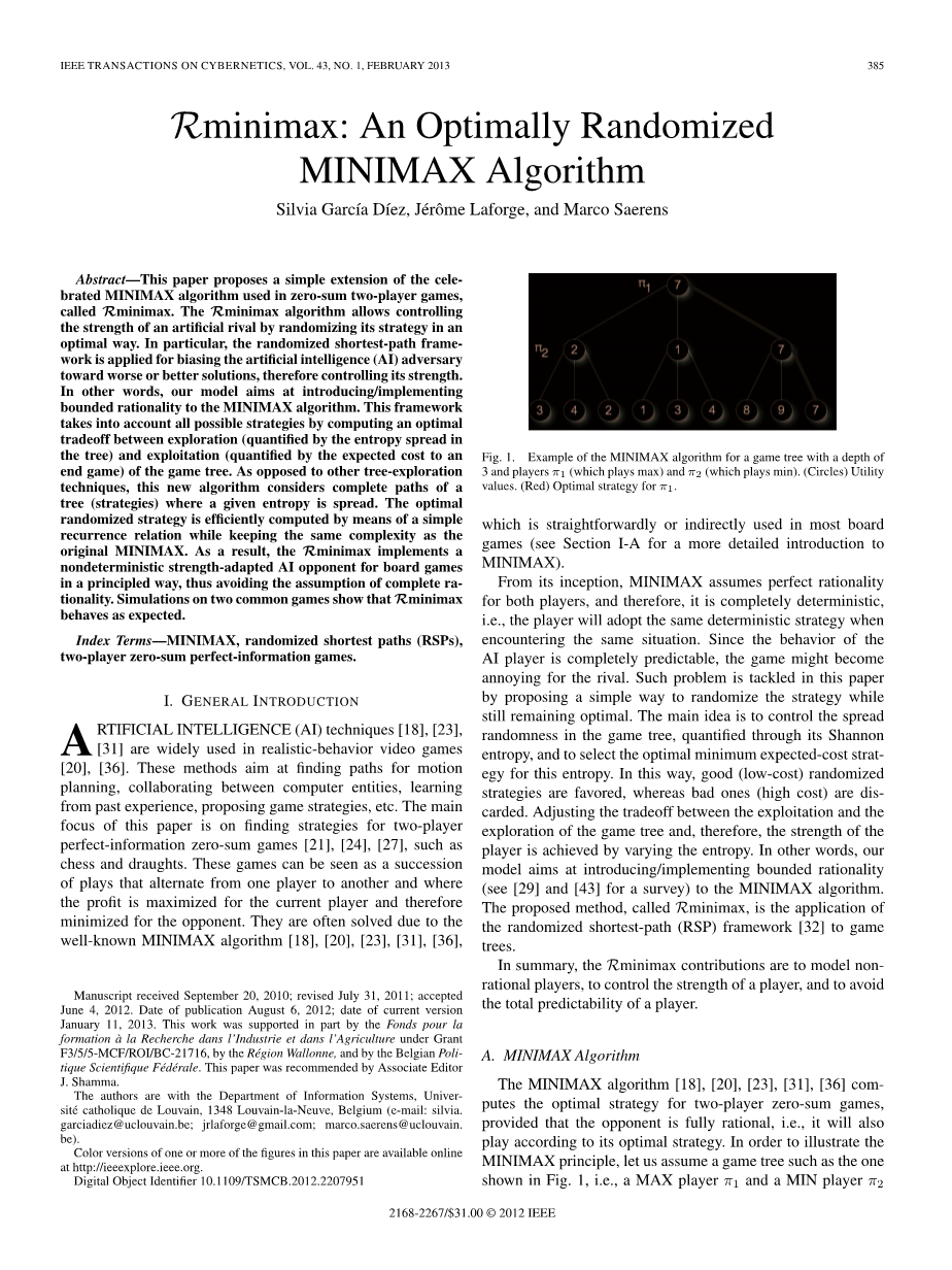 从一开始,MINIMAX就假定双方都是完全理性的,因此,当遇到相同的情况时,玩家将采用相同的确定性策略。由于AI玩家的行为是完全可以预测的,游戏可能会让对手感到厌烦。本文通过提出一种简单的方法,将该策略随机化,同时仍保持最佳状态,从而解决了这一问题。其主要思想是控制博弈树的传播随机性,通过其香农熵进行量化,并为该熵选择最优的最小期望成本策略。这样,好的(低成本的)随机策略得到了青睐,而坏的(高成本)则被抛弃了。在博弈树的开发与探索之间进行权衡,因此,玩家的强度是通过改变熵来实现的。换句话说,模型的目标是将有限理性(见[29]和[43])引入到极小极大算法。该方法被称为Rminimax,是随机最短路径(RSP)框架[32]在博弈树中的应用。