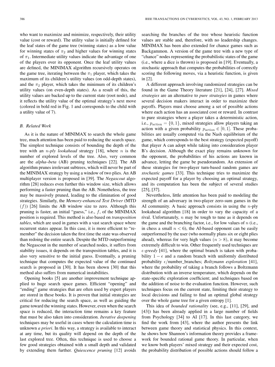 人工智能技术[18], [23],[31]广泛应用于现实行为视频游戏[20], [36]。这些方法的目的是寻找运动的路径,与计算机实体进行协作,学习过去的经验,提出游戏策略等。本文的重点是寻找完全信息零和双人游戏的策略[21], [24], [27],如国际象棋和跳棋。这些游戏可以被看作是一种交替的游戏,从一个玩家到另一个玩家,在这个游戏中,要使当前玩家的利润最大化,对手最小化。这通常会使用众所周知的minimax算法[18], [20], [23], [31], [36],大多数棋类游戏中都是直接或间接使用的(参见第I-A节,以更详细地介绍MINIMAX)。