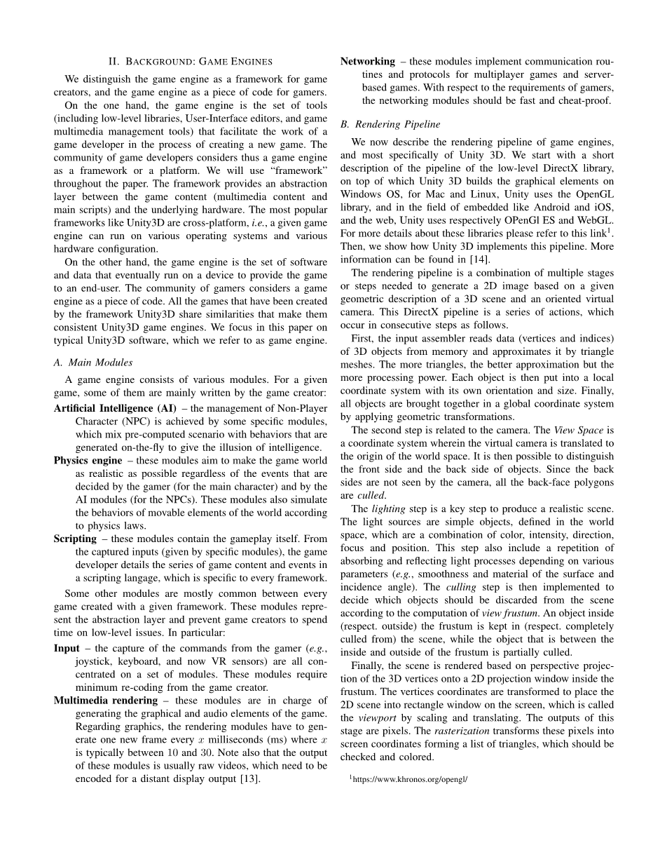 我们下面描述游戏引擎的渲染管道,尤其是Unity3D。 我们首先简要介绍低级DirectX库的管道,Unity3D在其上面构建Windows操作系统上的图形元素,而对Mac和Linux,Unity使用OpenGL库,嵌入式领域如Android、iOS和Web,Unity分别使用OPenGl、ES和WebGL。有关这些库的更多详细信息,请参阅此链接 1。下面,我们演示Unity 3D如何实现这个管道。更多信息可以在[14]中找到。