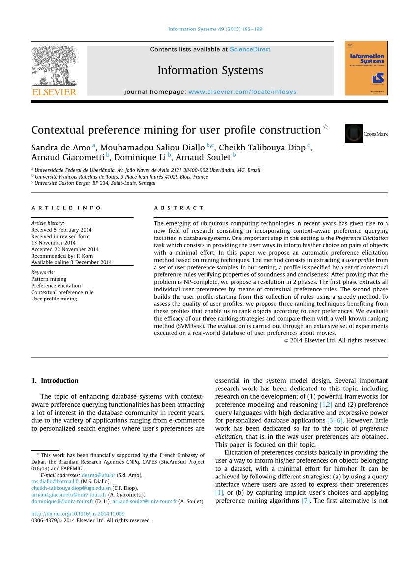 近年来随处可见的计算技术的兴起带来了一个新的研究领域,即将有关上下文理解出来的偏好查询设施结合到数据库系统中。这种布置中的一个重要步骤是首选启发任务,该任务包含了向用户提供通过最小努力来通知他/她对物体对的选择的方式。在本文中,我们提出了一种基于文本挖掘技术的自动偏好启发方法。该方法在于利用一组用户偏好样本提取用户画像。在我们的布置中,用户画像由一组上下文偏好规则来指定,以验证正确性和简洁性。在证明问题是NP完全的后,我们提出了两个阶段的解决方案。第一阶段通过上下文偏好规则提取所有个人用户偏好。第二阶段使用贪婪方法从这组规则开始建立用户画像。为了评估用户画像的质量,我们提出了三种受益于这些画像的排名技术,使我们能够根据用户的喜好对对象进行排名。我们评估我们三种排名策略的有效性,并将其与着名的排名方法(SVMR ank)进行比较)。评估是通过在基于电影的用户偏好的真实世界数据库上执行的大量实验来进行的。