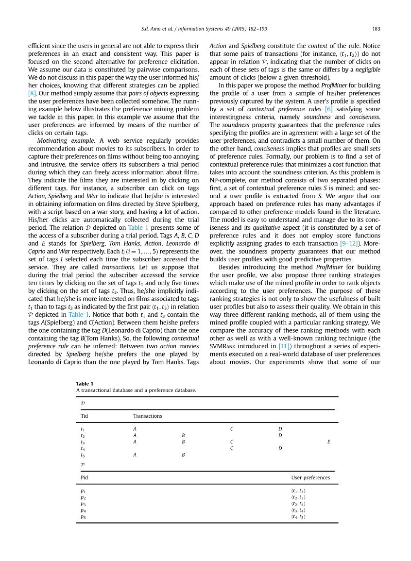 激励的例子:网络服务定期向其订户提供关于电影的推荐。为了捕捉他们对电影的偏好而不会太烦人和侵入性,该服务为其订户提供了试用期,在此期间他们可以自由访问电影信息。他们通过点击不同的标签来表明他们感兴趣的电影。例如,订阅者可以点击标签Action,Spielberg和War来表明他/她有兴趣通过史蒂夫斯皮尔伯格导演的电影获取信息,并且基于战争故事创作剧本并采取很多行动。他/她的点击在试用期间自动收集。关系d在表1中描述了在试用期间一些用户的访问。标签A,B,C,D和E分别代表斯皮尔伯格,汤姆汉克斯,行动,莱昂纳多迪卡普里奥和战争。每个ti(i=1,hellip;,5) 表示每次用户访问服务时我为其选择的一组标签。他们被称为交易。假设在试用期间,用户通过点击标签集t 1访问服务十次,并且通过点击标签集t 3仅仅五次。因此,他/她暗示他/她对与标签t 1相关联的电影比对标签t 3更感兴趣,如第一对所示 〈t1,t3〉 关系 P如表1所示。请注意,t 1和t 3都包含标签A(斯皮尔伯格)和C(行动)。在他们之间,他/她比包含标签B(汤姆汉克斯)的标签更喜欢包含标签D(莱昂纳多迪卡普里奥)的标签。因此,可以推断出以下背景偏好规则:在斯皮尔伯格执导的两部动作电影中,他/她更喜欢莱昂纳多迪卡普里奥扮演的那部电影,而不是汤姆汉克斯扮演的电影。标签行动和斯皮尔伯格构成上下文的规则。请注意,一些交易对(例如, 〈t1,t2〉 )不会出现在关系中 P,表明这些标签集中每个标签的点击次数相同或者可以忽略不计的点击次数(低于给定阈值)。