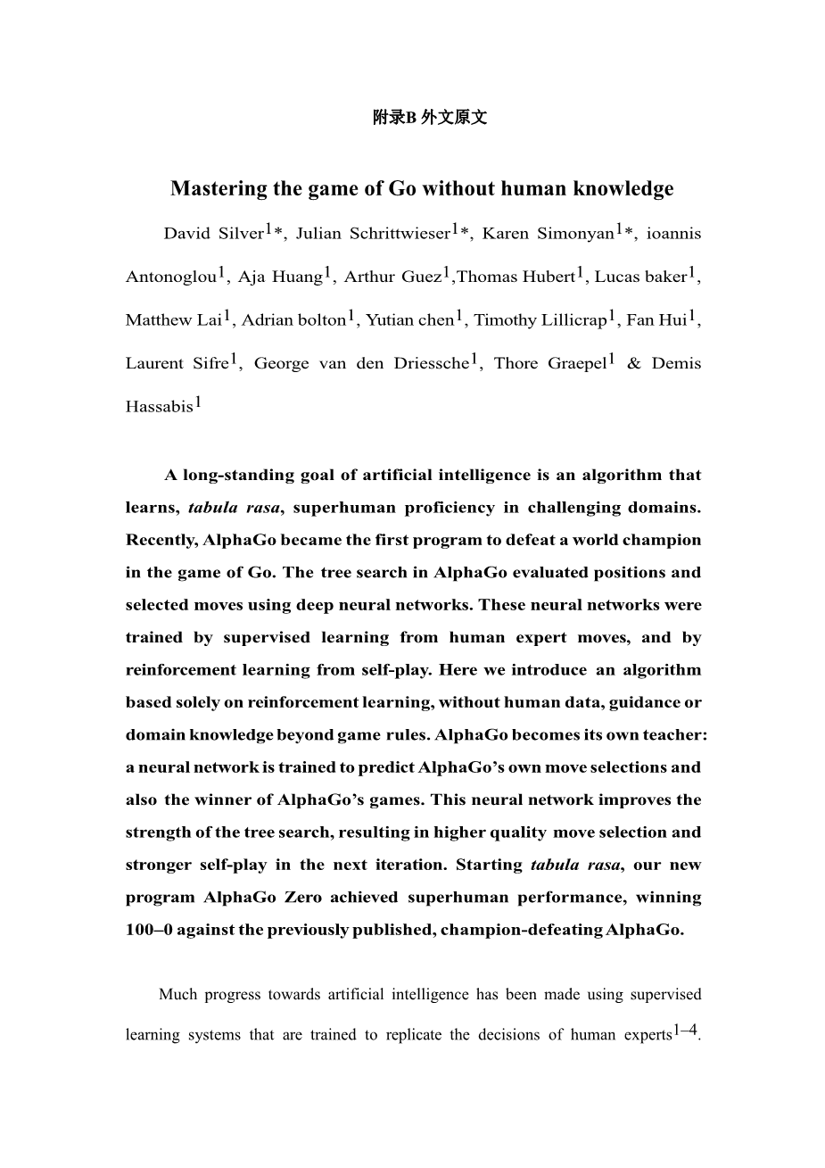 人工智能的一个长期目标是从“白板”开始,在挑战性领域达到超越人类的学习算法。最近,AlphaGo成为第一个在围棋中击败世界冠军的程序。AlphaGo中的树搜索使用深度神经网络评估局面和选定走子。这些神经网络是通过来自人类专家下棋的监督学习和通过从自我对弈中强化学习来训练的。在这里,我们介绍一个完全基于强化学习的算法,无须人类数据、指导或游戏规则以外的领域知识。AlphaGo成为自己的老师:训练一个神经网络,预测AlphaGo自己的走子选择。这个神经网络提高了树搜索的强度,在下一次迭代中产生更高质量的走子选择和更强的自我对弈。从“白板”开始,我们的新程序AlphaGo Zero实现了超人的表现,对之前的程序AlphaGo赢得了100-0的成绩。