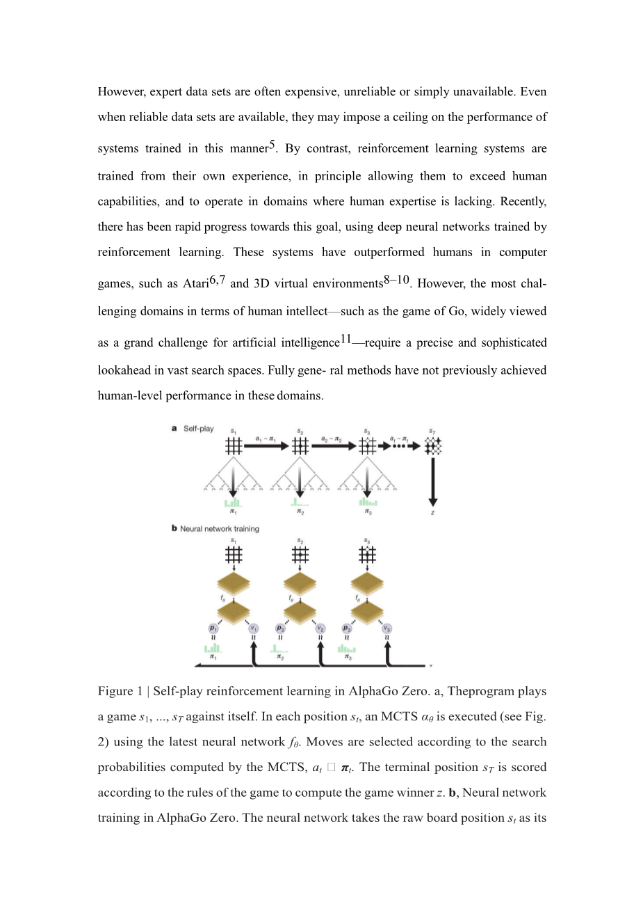在人工智能方面取得了很大的进展,使用了经过训练的监督学习系统来复制人类专家的决策。但是,专家数据往往昂贵,不可靠,或者根本无法使用。即使有可靠的数据,也可能会对以这种方式进行训练的系统的性能施加上限。相比之下,强化学习系统是根据它们自己的经验进行训练的,原则上允许它们超越人类的能力,并在缺乏人类专家的领域工作。最近,通过强化学习训练的深度神经网络,朝着这个目标快速发展。在Atari和3D虚拟环境等电脑游戏中,这些系统已经超越了人类。然而,在人类智力方面最具挑战性的领域 - 比如被广泛认为是人工智能面临的巨大挑战的围棋游戏 - 在广阔的搜索空间中需要精确和复杂的前瞻。完全通用的方法以前在这些领域没有实现人类级别的表现。