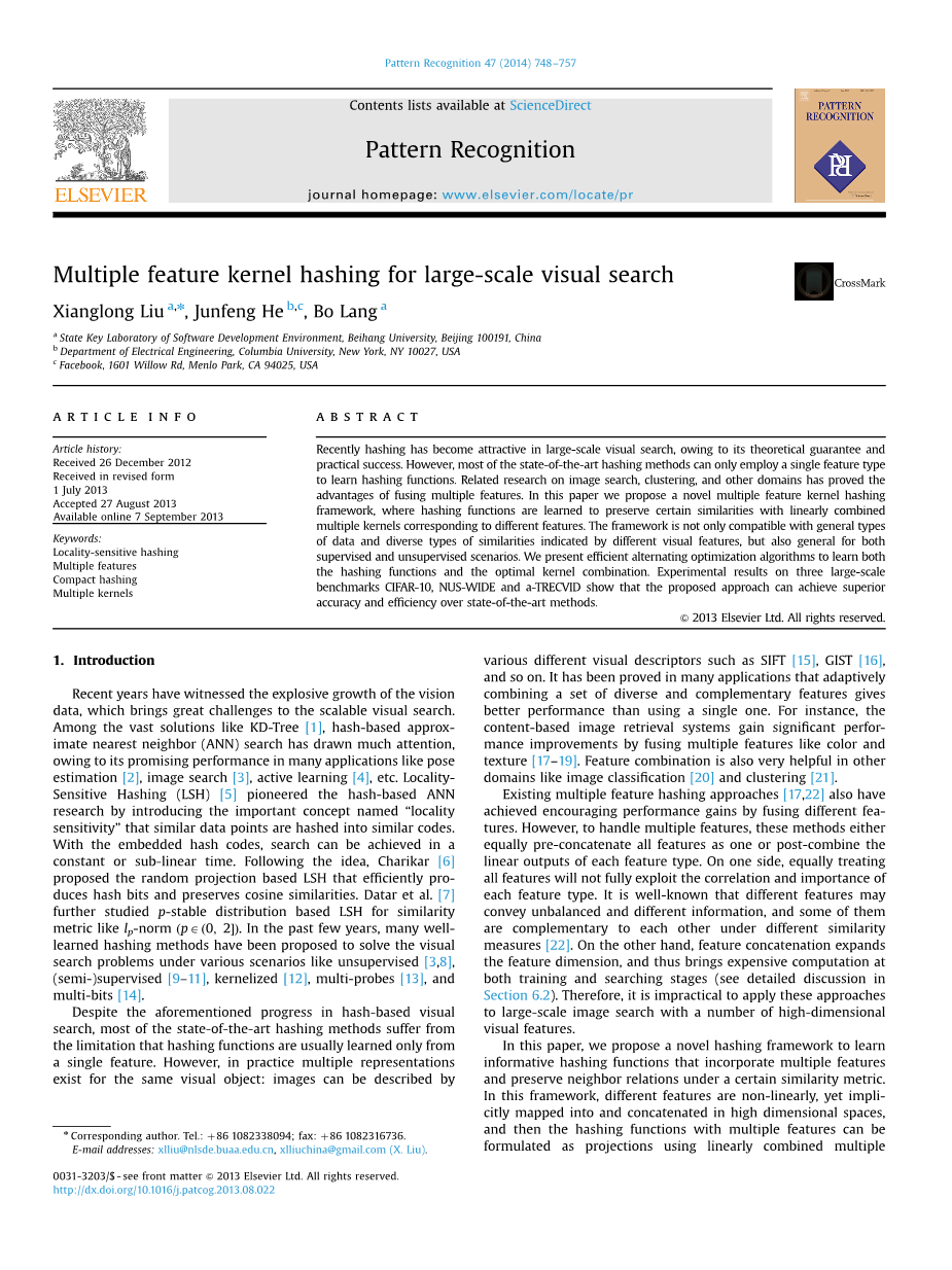 尽管在基于哈希的视觉搜索方面有上述进展,但大多数现有技术的哈希方法都受限于哈希函数通常仅从单个特征学习的限制。但是,在实践中,对于相同的视觉对象存在多个表示:图像可以用来描述各种不同的视觉描述符,如SIFT[15],GIST[16],等等。在许多应用中已经证明,自适应地组合一组不同的和互补的特征比使用单一特征具有更好的性能。例如,基于内容的图像检索系统通过融合多种特征如颜色和纹理[17–19]来显着提高性能。特征组合在图像分类[20]和聚类[21]等其他领域也非常有用。