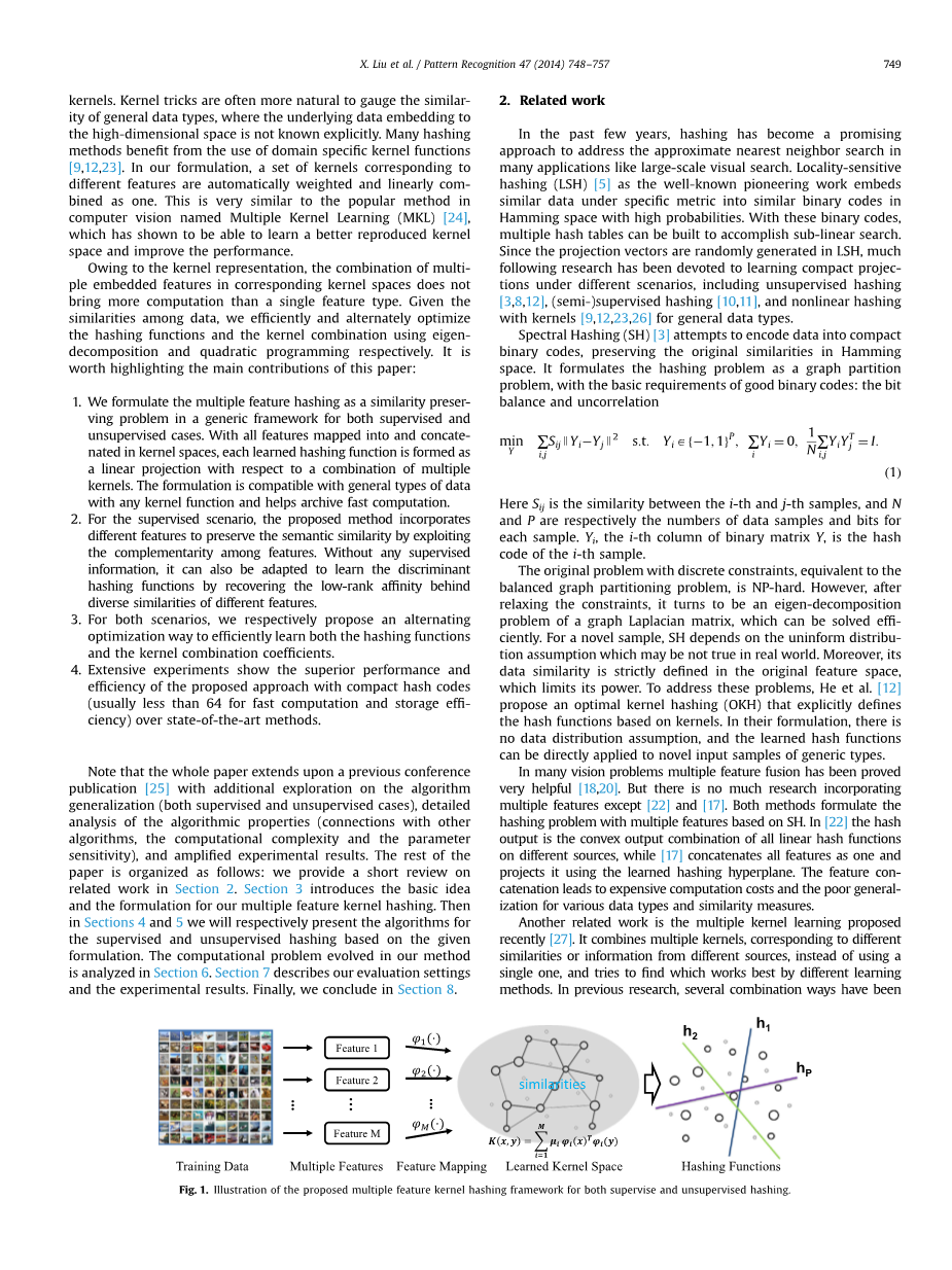 在本文中,我们提出了一种新的哈希框架来学习信息哈希函数,这些哈希函数结合了多个特征并在一定的相似性度量下保留了相邻关系。在这个框架中,不同的特征是非线性的,但隐式映射并连接到高维空间中,然后具有多个特征的哈希函数可以被表示为使用线性组合多重内核。内核技巧通常更加自然,以衡量一般数据类型的相似性,其中底层数据嵌入高维空间并不明确。许多哈希方法受益于使用特定于域的内核函数[9,12,23]。在我们的公式中,对应于不同特征的一组内核被自动加权并且作为一个线性组合。这与计算机视觉中被称为多核学习(MKL)[24]的流行方法非常相似,该方法能够学习更好地再现内核空间并提高性能。