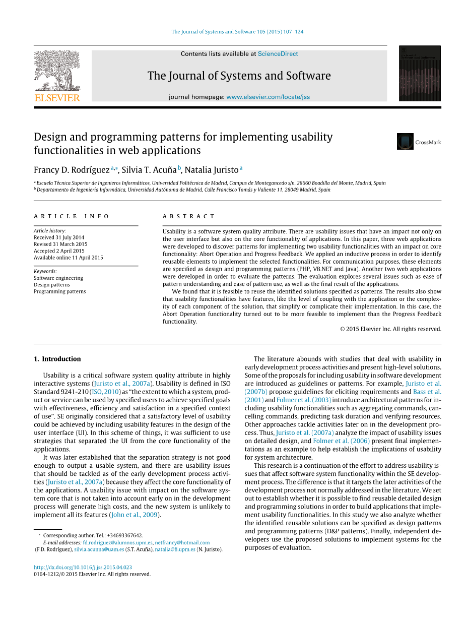 可用性是软件系统的质量属性。可用性问题不仅影响用户界面,而且影响应用程序的核心功能。在本文中,开发了三个Web应用程序,以发现两种可用性功能的模式,它们对核心功能有影响:中止操作和进度反馈。我们采用归纳过程,以确定可重用的元素来实现所选择的功能。为了沟通方便,这些元素被具体为设计和编程模式(PHP、VB.NET和java)。为了评估模式,开发了另外两个Web应用程序。评价探究等模式的理解和使用缓解模式的几个问题,以及应用的fi最终结果。我们发现重用指定为模式的标识解决方案是可行的。结果还表明,可用性功能具有一些特点,如与应用程序的耦合程度或解决方案的每个组件的复杂性,从而简化或复杂化它们的实现。在这种情况下,终止操作功能比实现进度反馈功能更容易实现。