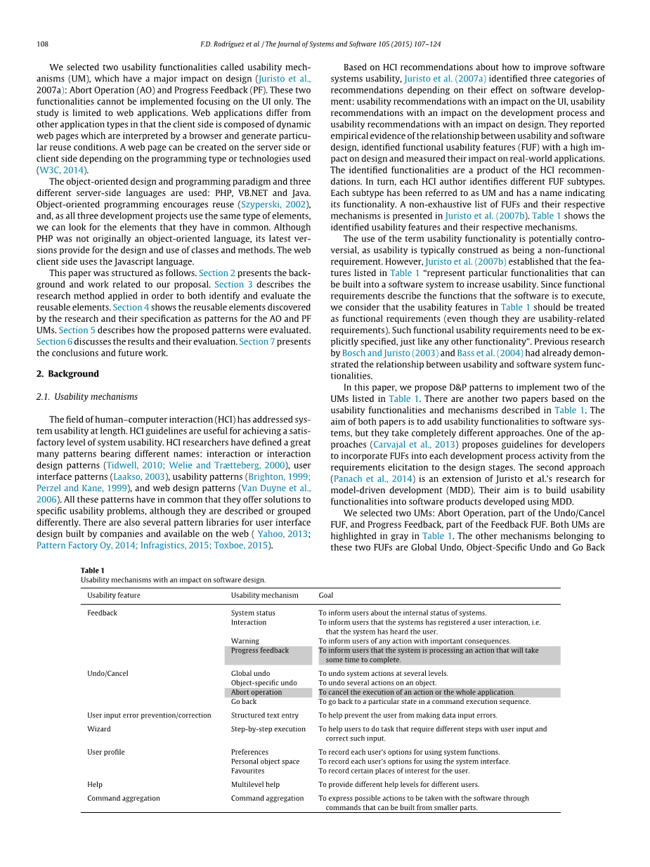 在本文中,我们提出了D&P模式来实现表1中列出的两个UM。另外还有两篇文章基于表1中描述的可用性功能和机制。这两篇论文的目的是为软件系统添加可用性功能, 但他们采取完全不同的方法。 其中一种方法(Carvajal et al。,2013)提出了开发者将FUF纳入从需求引发到设计阶段的每个开发过程活动的指导方针。 第二种方法(Panach等,2014)是Juristo等人对模型驱动开发(MDD)的研究的延伸。 他们的目标是将可用性功能集成到使用MDD开发的软件产品中。