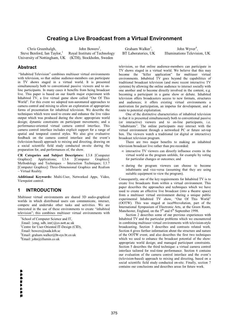 “真人电视”将多用户的虚拟环境与电视相结合,让在线的观众可以参与虚拟世界中的电视节目。其表现形式是同时兼顾传统的被动观众和在线参与者。在大多数情况下它得利于现场直播。本文基于我们对真人电视的第四个实验,这是一个叫“Out Of This World”的现场虚拟游戏节目。对于这个实验,为了探索适合真人电视的表演形式,我们采用了非自动化的方式进行相机的控制和组合。我们描述了用于创建和增强节目中制作的实况视频输出的技术:适当的世界设计、参与者动作的动态约束和一个面向性能的虚拟摄像头控制界面。该摄像机控制界面包括对一系列空间和时间控制风格的明确支持。我们还对摄像机控制界面和事件(基于电视)的混合和指导方法提供评估反馈,并利用社会科学领域研究在现场准备和演出期间的节目。