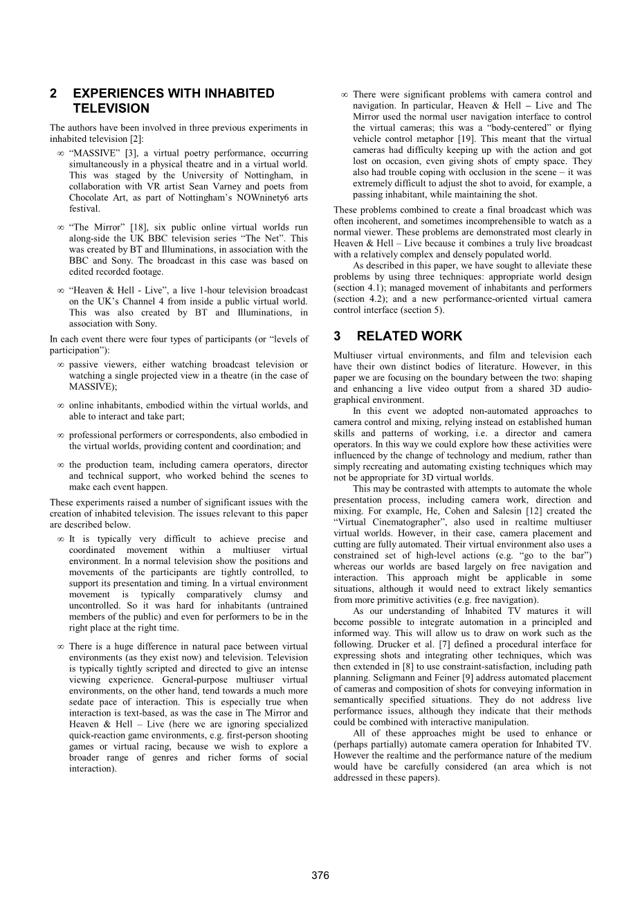 第2节介绍了我们以前的一些有关真人电视的经历,以及我们在将多用户虚拟环境与电视风格广播相结合时遇到的特殊问题。第3节描述和对比相关的工作。第4节进一步介绍了OOTW活动的结构和性质,还介绍了我们用来增强节目广播潜力的前两种技术:适当的世界设计和受管参与者约束。第5节描述了第三种技术:为实时性能量身定制的虚拟摄像机控制界面。第6部分包含我们对相机控制界面的评估以及在现场进行的基于社会科学领域的研究和基于电视的混合和指导方法。最后,第7节包含我们的结论,并描述未来工作的领域。