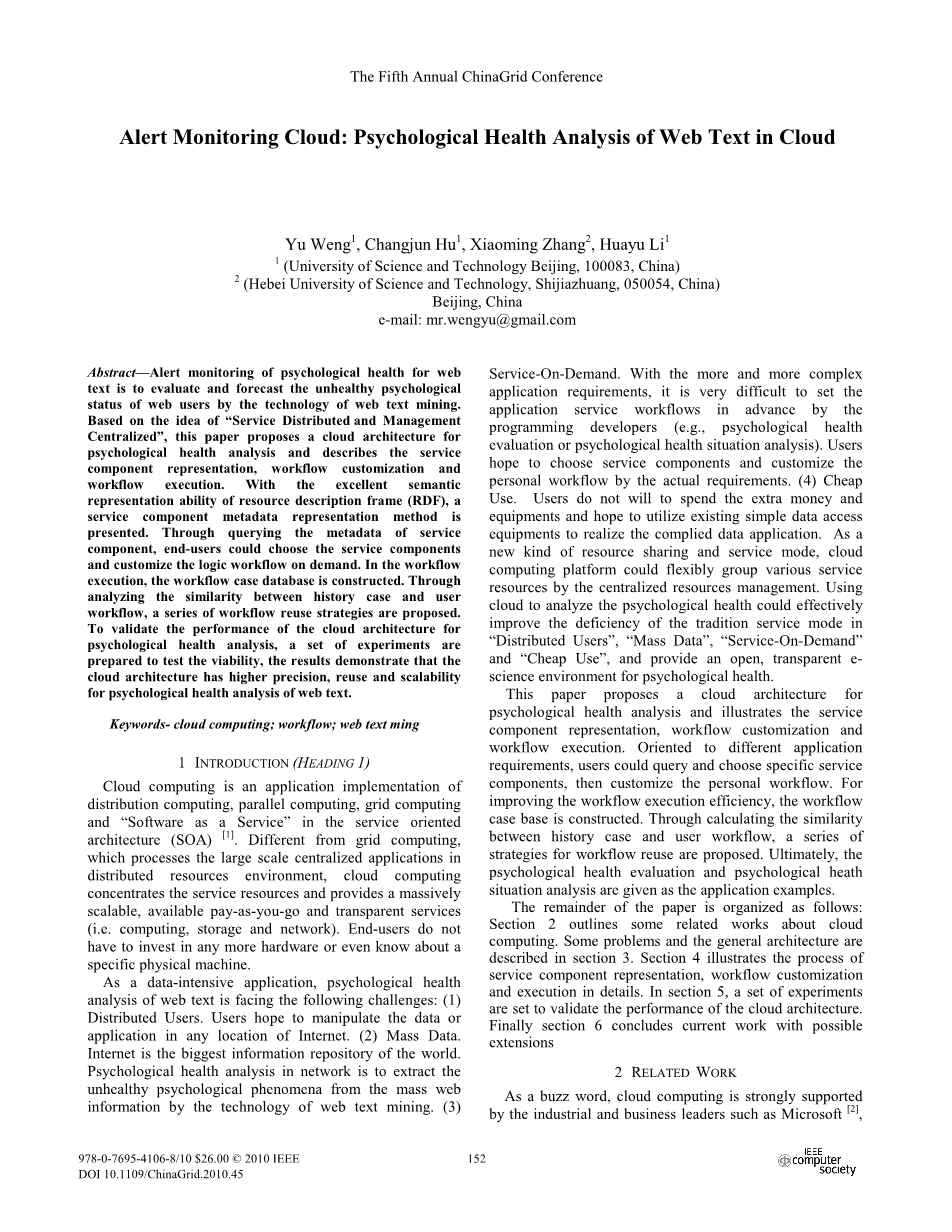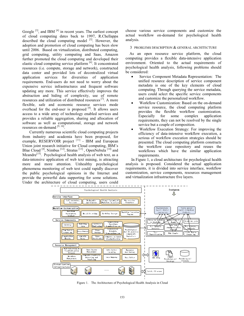 联合研究云计算,IBM的蓝云[4],Nimbus [12], Stratus [13], open星云[14]和。Meandre[15]。网络文本的心理健康分析作为web文本挖掘的一种数据密集型应用,正受到越来越多的关注。对网络文本的不健康的心理现象的监测,可以迅速地在互联网上发现公众的心理观点,为一些解决方案提供有力的数据支持。在云计算架构下,用户可以选择各种服务组件,并根据心理健康分析定制实际的工作流程。