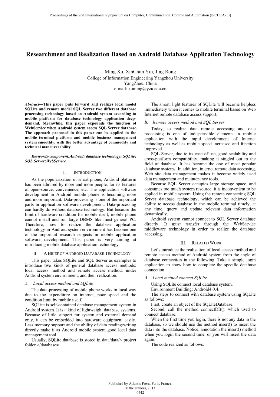 摘要 - 本文提出并实现了基于Android系统的本地模型SQLite和远程模型SQL Server两种不同的数据库处理技术,针对数据库技术应用深层次需求的移动平台。同时,本文阐述了Android系统访问SQL Server数据库时WebService的功能。本文提出的方法可以顺利应用于移动终端平台和移动业务管理系统,具有商品和技术可操作性更好的优势。
