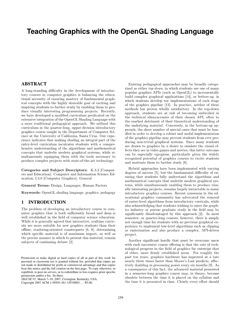 计算机图形学基础课程发展的一个长期存在的困难是确保学生掌握计算机图形学基础和使学生保持足够的学习热情之间的平衡,目前,我们已经开发出一种改进的基于OpenGL与更传统的教学方法着色语言的广泛集成的课程。我们利用这个课程在加州大学圣克鲁斯分校计算机科学系四分之一的高年级学生中试授,我们的经验表明,使遮光入门级课程的一个组成部分灌输学生的算法和背后的现代图形系统的数学概念一个全面的了解,同时提供必要的生产与国家复杂项目的工具装备他们最先进的技术。