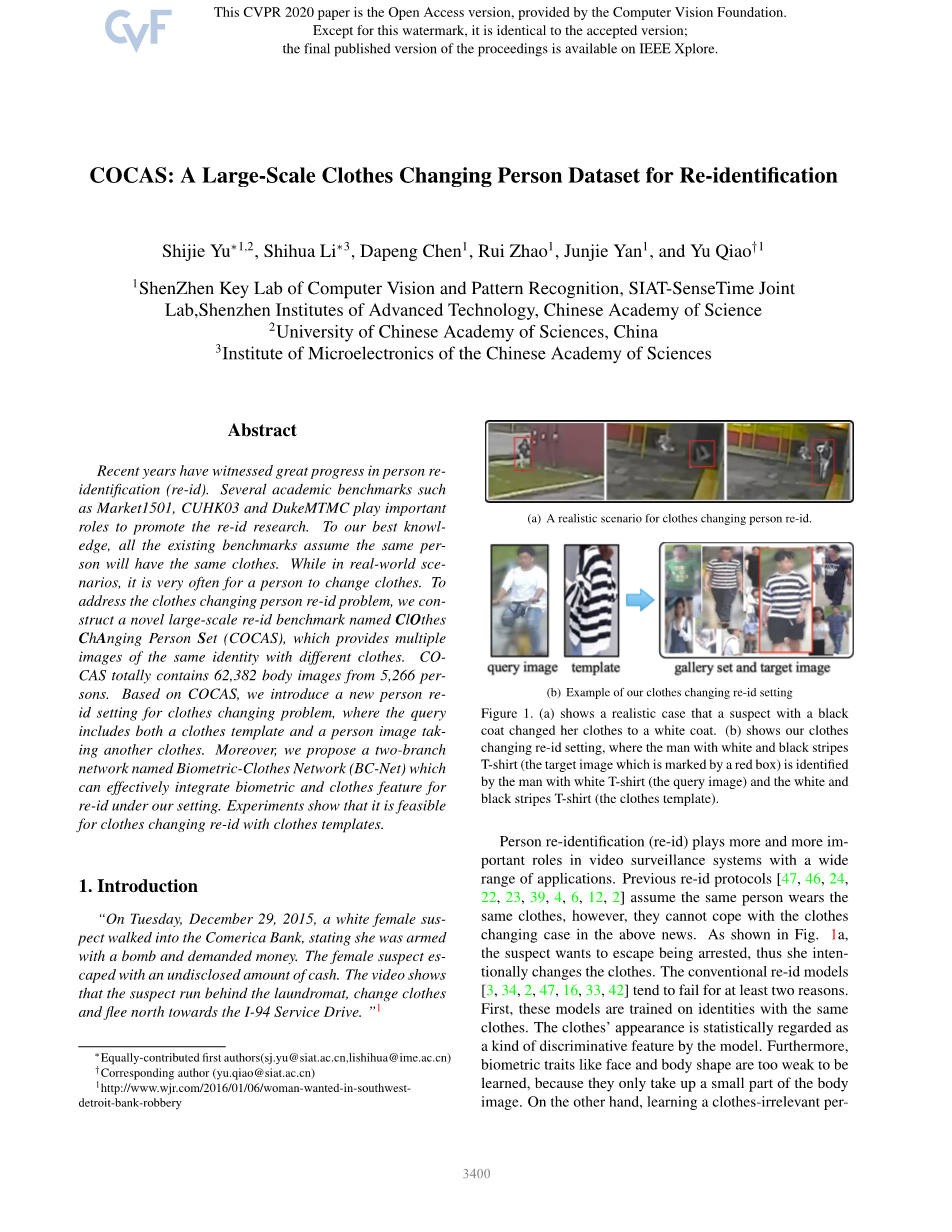 “图1。(a) 展示了一个现实的案例,一个穿着黑外套的嫌疑人把她的衣服换成了白外套。(b) 显示了我们的衣柜和身份证设置,其中白、黑条纹T恤(目标图像用红框标记)由白T恤(查询图像)识别,而白、黑条纹T恤(服装模板)人员再识别(re-id)在视频监控系统中扮演着越来越重要的角色,具有广泛的应用前景应用。以前的re-id协议[47,46,24,22,23,39,4,6,12,2]假设同一个人穿同一件衣服,但是他们无法处理上述新闻中的衣服交换案例。如图1a所示,犯罪嫌疑人为了逃避被捕,故意换衣服。传统的re-id模型[3,34,2,47,16,33,42]往往至少在两个月内失效原因。首先,这些模型都是训练在同一身份上的sameclothes。该模型将服装外观作为一种识别特征进行统计处理。此外,像脸和体型这样的生物特征太弱了,无法识别,因为它们只占身体图像的一小部分。另一方面,学习一个与衣服无关的模型也很困难。如果只利用不清晰的人脸和体形,该模型很难应用于大规模的人体图像集信息。我们相反,考虑一个更简单但实用的衣服更换re-id问题,如图1b所示:通过衣服模板图像和穿着另一个衣服的同一个人的图像来搜索一个人的图像(目标图像)衣服(查询图像)。与现有的re-id设置相比,这种设置利用了服装模板,仍然有着广泛的实际应用。举两个例子,为了找到丢失的孩子/老人,这个家庭只需要提供一张丢失的孩子/老人的近照和一张孩子/老人穿的衣服的图片。对于服装异样的跟踪,警方可以通过一幅拍摄的图像和一个机智的描述或留下的服装模板找到更多相关的图像嫌犯。去为了解决这个问题,我们建立了一个大规模的基准点,命名为ClothesChanging Personse(COCAS),基准点包含62832张人体图像,每个儿子5266张,每个人有5sim;25张图片和2sim;3张图片衣服。为了每个人,我们把一种衣服的图像移到图库中,这些图像就是目标图像。我们还从网上找到了一个衣服模板,它和每个儿子的目标图片中的衣服相似。所有剩余的图像都放入查询中套入事实上,收集如此大规模的与人有关的数据是不平凡的。在第三节中,我们将详细描述数据收集、人与衣服关联、隐私保护策略和协议定义。提出了一种具有两个分支的生物特征服装网络(BC-Net),一个分支提取人脸、体形、发型等人体特征。另一个分支提取衣服特征,查询图像和目标图像的输入是不同的。一幅服装图像是利用服装模板作为分支来更好地匹配目标图像,而一幅目标图像是利用服装检测模块从中获取一幅服装图像本身。在总结,本文的主要贡献有三个方面:(1)定义了一类由人体图像和服装模板组成的换衣识别问题。(2) 建立了一个新的大规模服装识别数据集COCAS。(3)提出了一种BC网络,通过提供目标图像的服装模板,将与服装相关和与服装无关的信息进行分离,使服装识别问题成为可能。进行了包括服装外观如何影响识别率在内的交互烧蚀研究。BC网络的性能表明,采用服装模板可以促进服装识别率的变化。