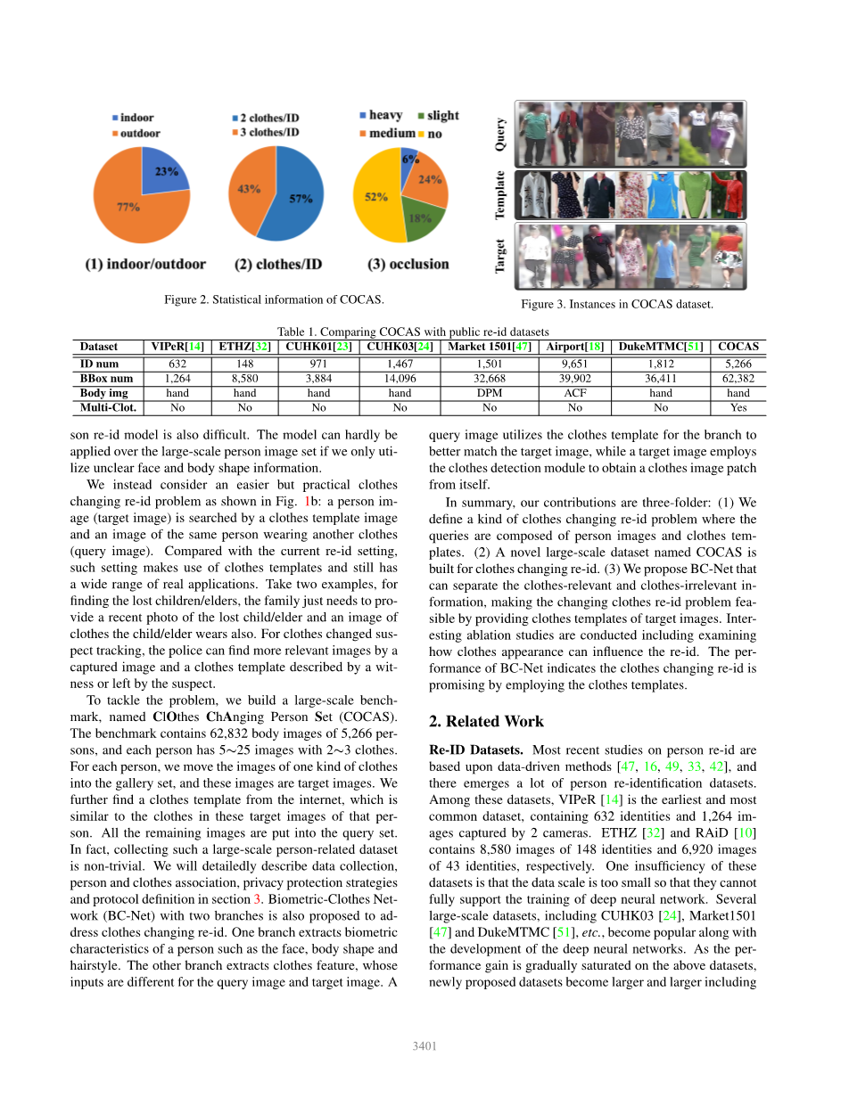 COCAS是一个大规模的个人识别基准,它为同一个人提供不同的衣服。它包含5266个身份,每个身份平均有12个图像。图像在不同的真实场景(30个摄像头)中捕获图像,包括不同的照明条件(室内和室外)和不同的遮挡条件。与现有re-id基准的比较如表1所示,从COCAS数据集获取的几个实例如图3所示。