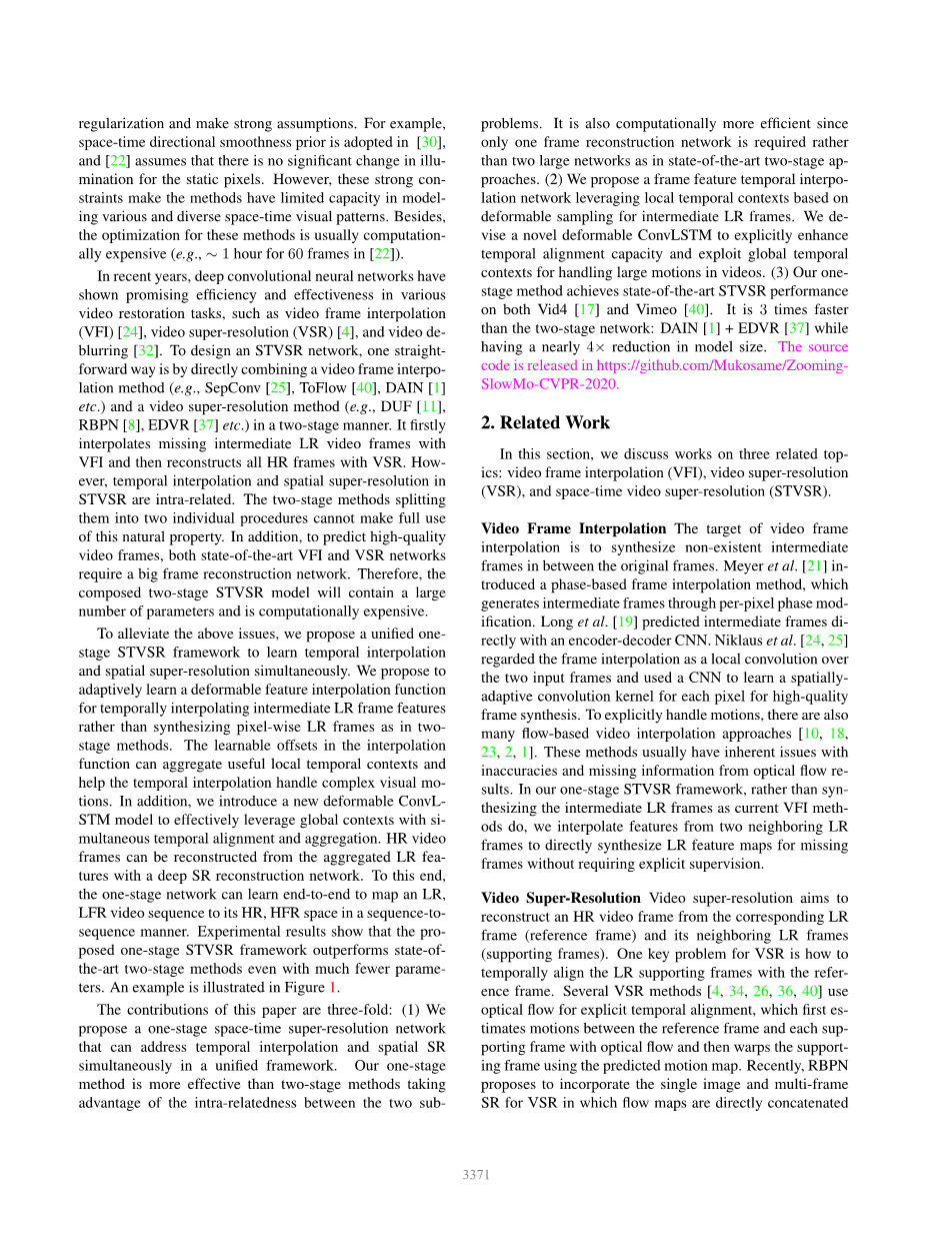 近年来,深度卷积神经网络在视频帧插值(V FI)[24]、视频超分辨率(V SR)[4]和视频去模糊[32]等多种视频恢复任务中表现出了很有前途的效率和有效性。 要设计一个STVSR网络,一个简单的方法是直接组合视频帧插值方法(例如,SepConv[25]、ToFlow[40]、DAIN[1]等。) 以及视频超分辨率方法(例如DUF[11]、RBPN[8]、EDVR等。) 以两阶段的方式。 首先用VFI对缺失的中间LR视频帧进行插值,然后用VSR重建所有HR帧。 然而,STVSR中的时间插值和空间超分辨率是内部相关的。 两阶段方法将它们分成两个单独的程序,不能充分利用这一自然属性。 此外,为了预测高质量的视频帧,最先进的VFI和VSR网络都需要一个大的帧重建网络。 因此,组成的两阶段STVSR模型将包含大量的参数,并且在计算上是昂贵的。