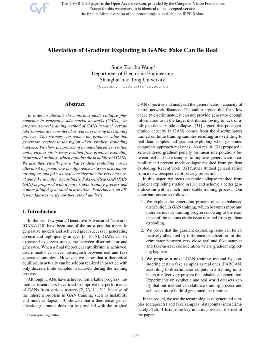 为了缓解生成对抗网络(GAN)中臭名昭著的模式崩溃现象,我们提出了一种新的GAN训练方法训练期间将假样本视为真实样本过程。 这种策略可以降低梯度值发生器接收梯度爆炸的区域发生。 我们展示了不平衡一代的过程梯度爆炸导致恶性循环问题在实践培训中,这解释了GAN的不稳定性。我们还从理论上证明了梯度爆炸可以通过惩罚辨别器输出与非常接近的真实和伪造样本的真实伪造考虑因素之间的差异来缓解这种情况。 因此,提出了具有更稳定训练过程的虚假GAN(FARGAN)。更忠实的分布。 在不同数据集上进行的实验验证了我们的理论分析。关键词:Ad Hoc移动无线网;多媒体;路由协议;跨层设计