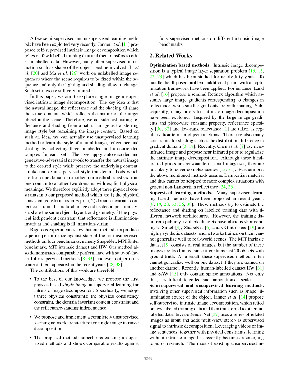 最近,一些半监督和非监督学习方法被开发出来。Janner等人提出了一种基于少量标记训练数据的自监督本征图像分解方法,并将其转化为其他未标记数据。然而,还需要涉及许多其他有监督的信息,如物体的形状。Li等人和Ma等人处理未标记的图像序列,其中场景需要固定在序列内,并且只有照明和着色允许改变。这样设置仍然非常有限。