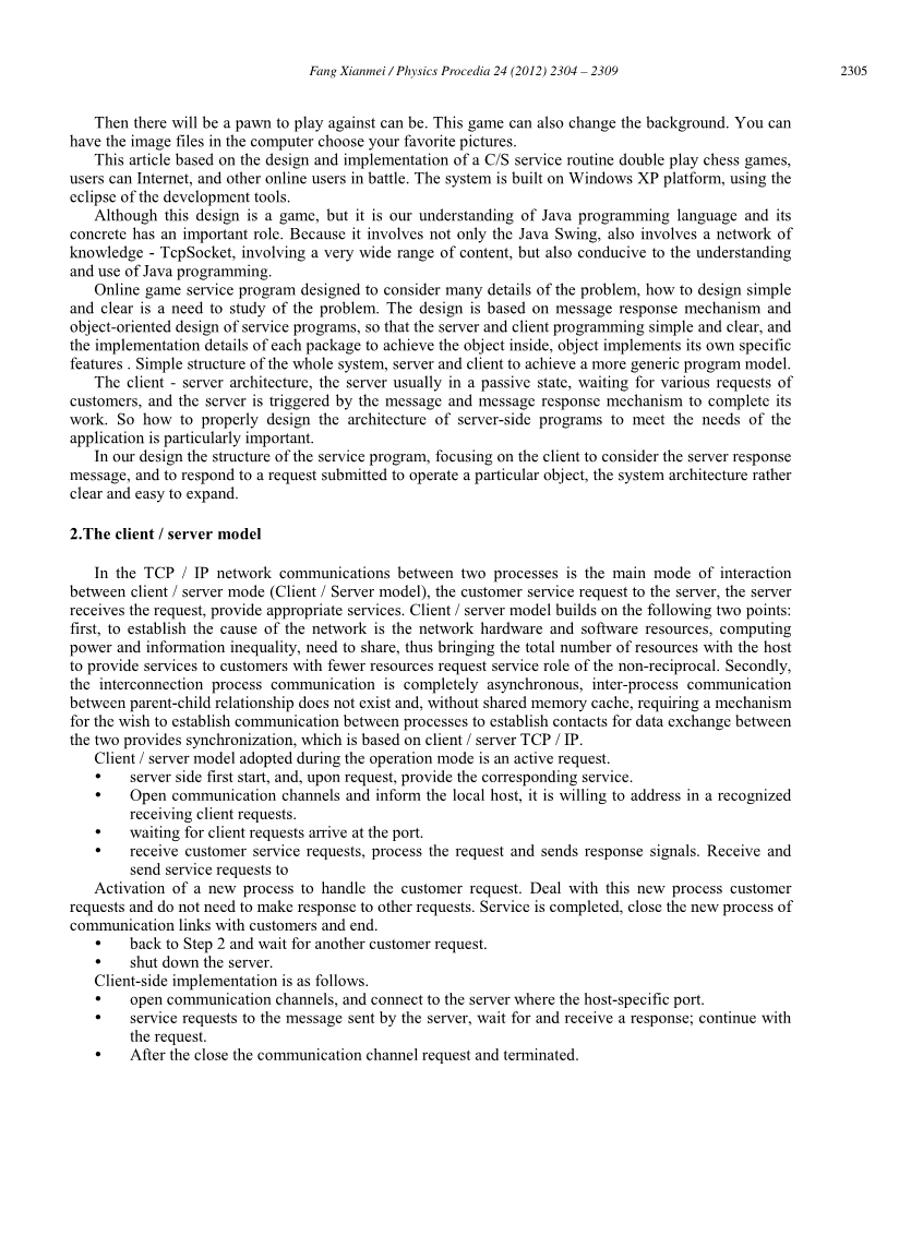 本文描述了国内网络游戏的现状。结合目前本地网络游戏的现状,我们根据所掌握的信息,对中国象棋等多线程tcp客户端和服务器端进行了研究,并对其内容和意义进行了探讨。结合Java的基础知识,根据Java Swing的使用信息,研究了面向对象的编译过程,以及网络程序的实现方法。本文研究了在Java Swing环境下对Sprocket进行网络编程的方法和过程。了解使用Java编译过程的基本过程以及如何编译网络过程。最重要的是如何实现一对机器的通信--C/S服务系统。在此基础上,提出了网络游戏中国象棋的数据结构、基本计算方法,以及该程序的服务器端和客户端的设计与实现。网络游戏象棋的设计可以分为几个模块:服务器模块、客户端模块和控制模块。