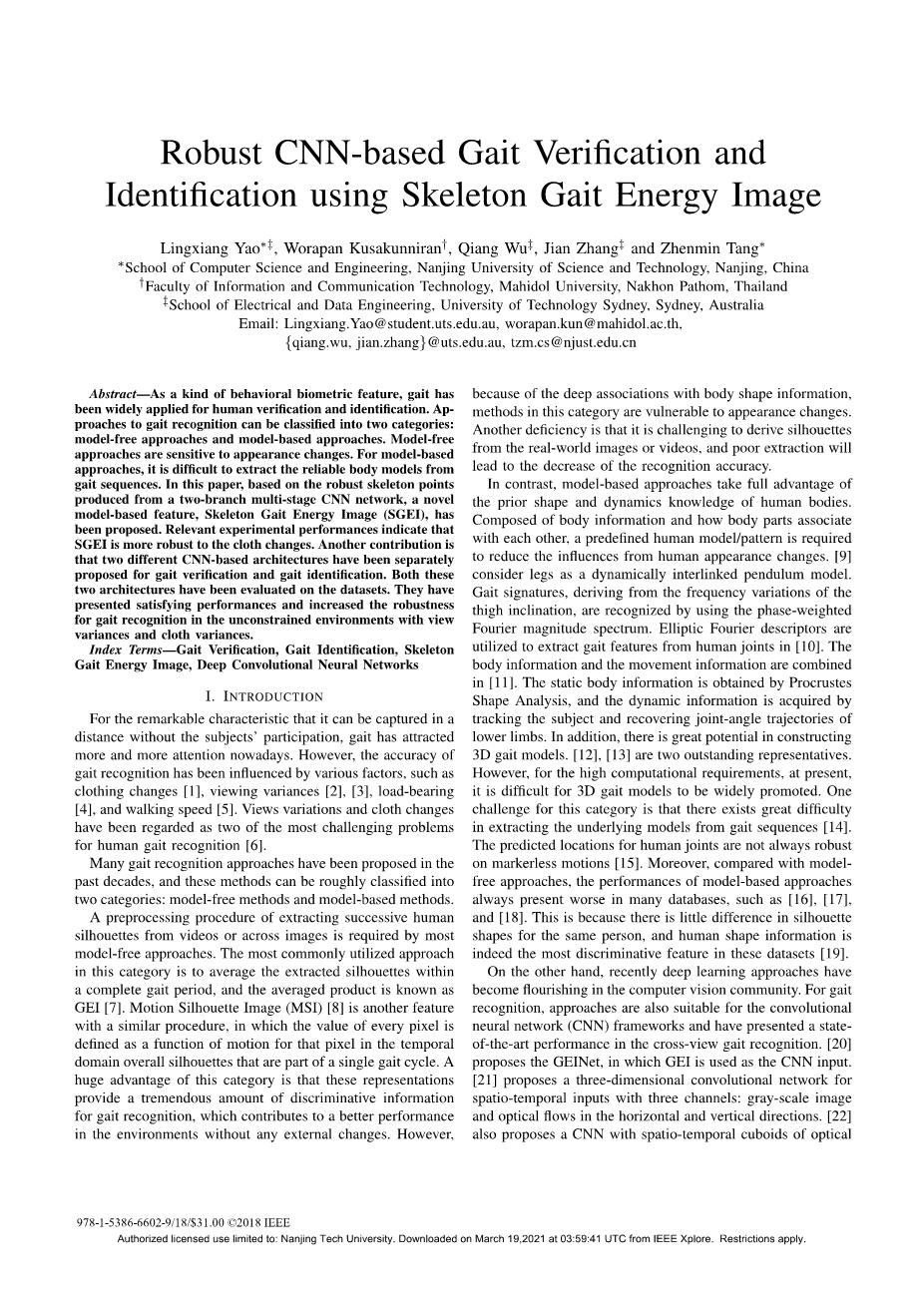 步态作为一种行为生物特征,被广泛应用于人体验证和鉴定。步态识别方法可分为两类:无模型方法和基于模型的方法。无模型方法对外观变化很敏感。但是对基于模型的,要从步态序列中提取出可靠的人体模型是很困难的。本文基于两分支多级CNN网络生成的鲁棒骨架点,提出了一种基于模型的特征——骨架步态能量图像(skeleton步态能量图像)。相关实验结果表明,SGEI对服装的变化更为稳健。另一个贡献是,两种不同的基于cnn的体系结构分别被提出用于步态验证和步态识别。这两种架构都已经在数据集上进行了评估。在无约束的环境下,利用视图方差和服装方差,提高了步态识别的鲁棒性,取得了令人满意的效果。