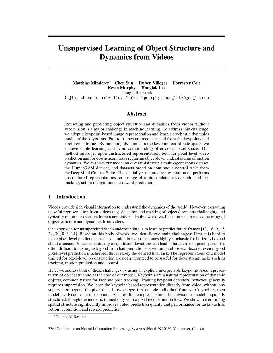 视频提供了丰富的视觉信息来了解世界的动态。然而,从视频中提取有用的表示(例如,检测和跟踪对象)仍然具有挑战性,通常需要昂贵的人工注释。在这项工作中,我们侧重于视频对象结构和动态的无监督学习。无监督视频理解的一种方法是学习预测未来的帧数[17、16、9、15、24、30、8、3、14]。基于这些工作,我们发现了两个主要的挑战:首先,很难做出像素级的预测,因为视频中的运动对于超过一秒的视界来说是高度随机的。由于语义上无关紧要的偏差会导致像素空间中出现较大的误差,因此通常很难根据像素损失来区分好的预测和坏的预测。其次,即使实现了良好的像素级预测,这也很少是期望的最终任务。经过像素级重建训练的模型表示不能保证对后续任务有用,如跟踪、运动预测和控制。在这里,我们通过使用对象结构的显式的、可解释的基于关键点的表示作为模型的核心来解决这两个挑战。关键点是动态对象的自然表示,通常用于面部和姿态跟踪。然而,训练关键点探测器通常需要监督。我们直接从视频中学习基于关键点的表示,不需要任何像素数据之外的监督,分为两个步骤:首先将单个帧编码为关键点,然后对这些关键点的动态进行建模。因此,虽然只训练了模型的像素重建损失,但动力学模型的表示是空间结构化的。我们发现,在执行动作识别和奖励预测等任务时,增强空间结构可以显著提高视频预测的质量和性能。