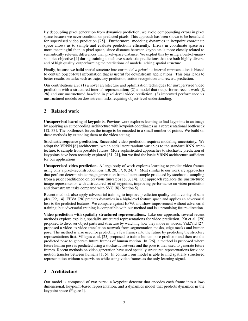 通过将像素生成与动态预测解耦,我们避免了像素空间中的复合误差,因为我们从不限制预测的像素。该方法已被证明是有益的监督视频预测[25]。此外,在关键点坐标空间中建立动力学模型可以使我们有效地对预测进行采样和评估。坐标空间中的错误比像素空间中的错误更有意义,因为关键点之间的距离比像素空间距离更接近于语义上的相关差异。我们利用这一点,在训练期间使用一个最佳的多样本目标[4]来实现既高度多样化又高质量的随机预测,从而超过缺乏空间结构的模型的预测。最后,因为我们预先将空间结构构建到模型中,所以它的内部表示形式会偏向于包含对下游应用程序有用的对象级信息。这种偏差导致更好的结果,如任务的轨迹预测,行动识别和奖励预测。我们的贡献有:(1)提出了一种新的无监督视频预测体系结构和优化技术,该结构具有结构化的内部表示;(2)在像素级视频预测方面,一个模型要优于最近的工作[8,28]和我们的非结构化基线;(3)在需要对象级理解的下游任务上,改进性能和非结构化模型。