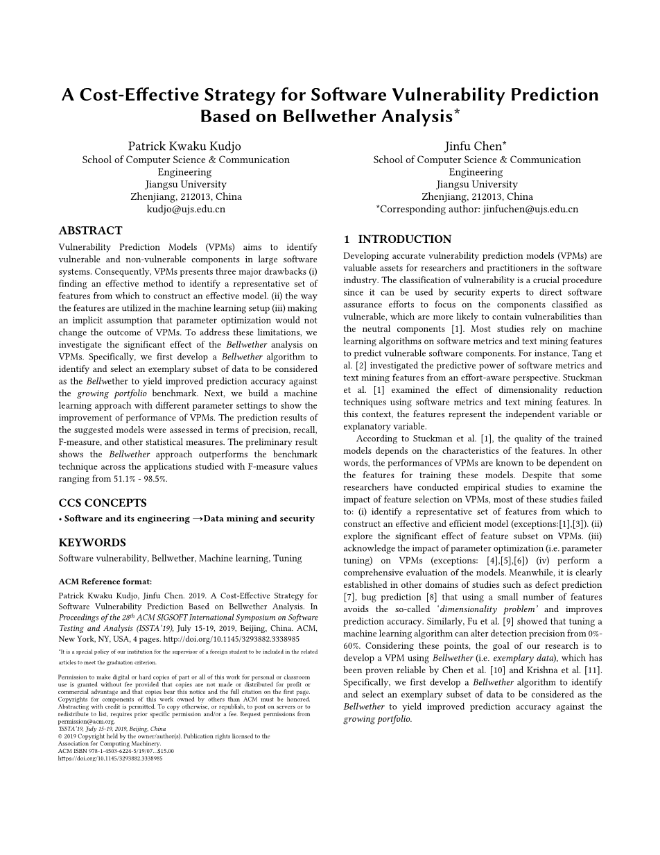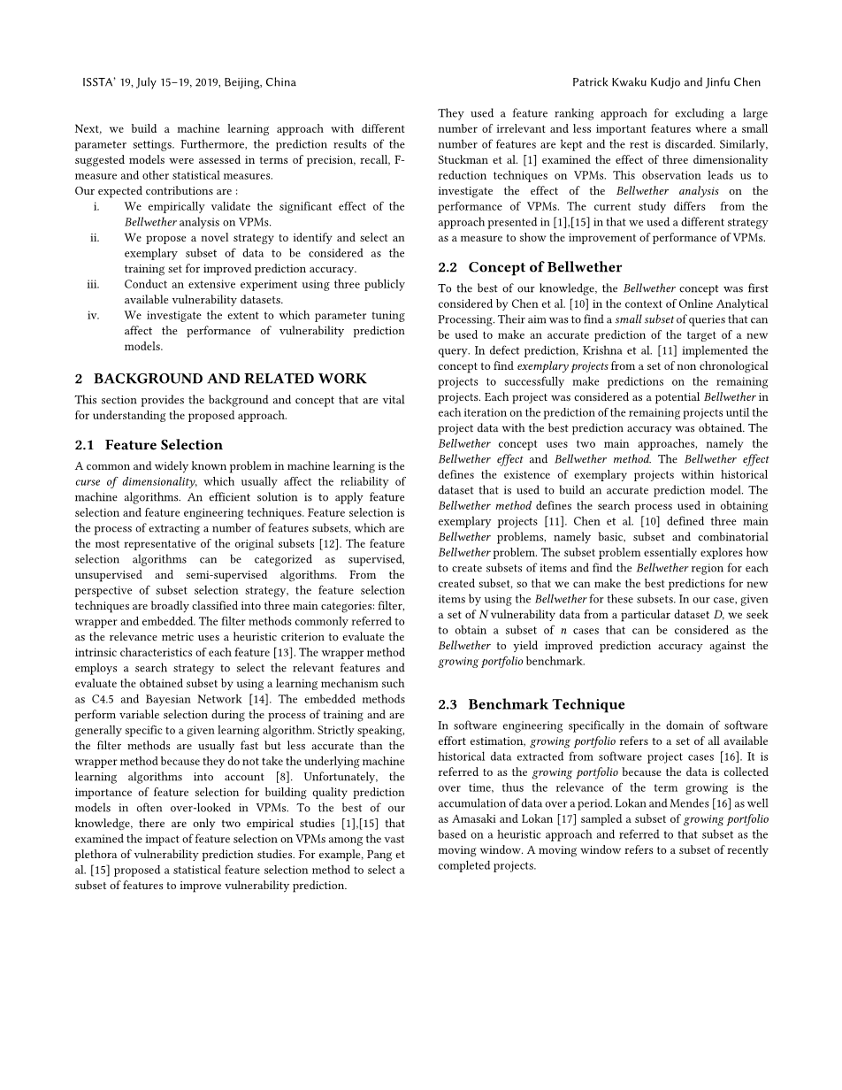 预测准确性。同样,Similarly, Fu et al.[9]显示调整机器学习算法可以将检测精度从0%-60%。考虑到这些要点,我们的研究目标是使用Bellwether开发VPM(即示例性数据),Chen et al. [10] 和 Krishna et al. [11]已证明是可靠的。 具体来说,我们首先开发一种Bellwether算法来识别并选择一个示例性的数据子集作为领头羊可以提高预测准确度。