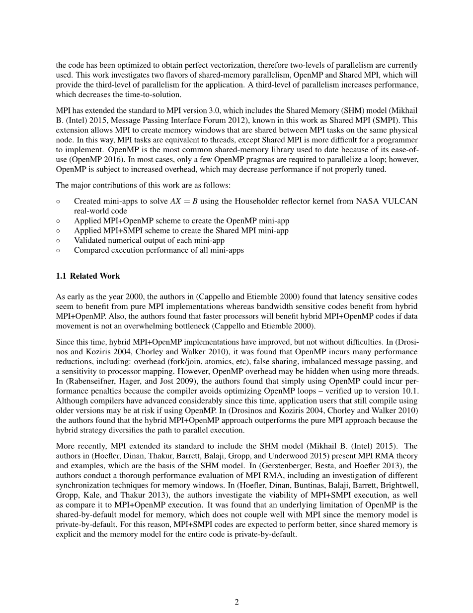 最近,MPI将其标准扩展到包含SHM模型(Mikhail B.(Intel)2015)。作者(Hoefler,Dinan,Thakur,Barret,Balaji,Gropp和Underwood,2015)介绍了MPI RMA理论和实例,这是SHM模型的基础。在(Gerstenberger,Besta and Hoefler2013)中,作者对MPI RMA进行了全面的性能评估,包括调查了不同的内存窗口同步技术。在(Hoefler,Dinan,Buntinas,Balaji,Barrett,Brightwell,Gropp,Kale andThakur 2013)中,作者研究了MPI SMPI执行的可行性,并将其与MPI OpenMP执行进行了比较。发现OpenMP的基本限制是内存默认共享模型,由于内存模型是默认的私有模式,所以与MPI不能很好地耦合。由于这个原因,MPI SMPI代码预计执行得更好,因为共享内存是显式的,整个代码的内荐模型是默认的私有的。