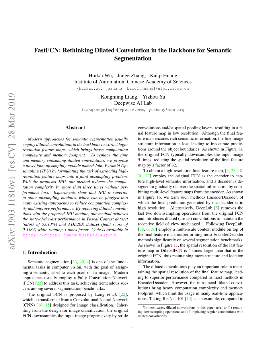 现代的语义分割方法通常采用在主干上展开卷积来提取高分辨率的特征图,这带来了沉重的计算复杂度和内存占用。为了替代耗时和内存消耗的扩展卷积,我们提出了一种新的联合上采样模块,称为联合金字塔上采样(JPU),该模块将提取高分辨率地物图的任务转化为联合上采样问题。该方法在不损失性能的前提下,将计算复杂度降低了三倍以上。实验表明,JPU优于其他上采样模块,可以接入现有的多种方法中,降低计算复杂度,提高性能。通过将扩展卷积替换为所提出的JPU模块,我们的方法在Pascal上下文数据集(mIoU为53.13%)和ADE20K数据集(final score为0.5584)中获得了最先进的性能,同时运行速度提高了3倍。代码可以在https://github.com/wuhuikai/FastFCN找到。
