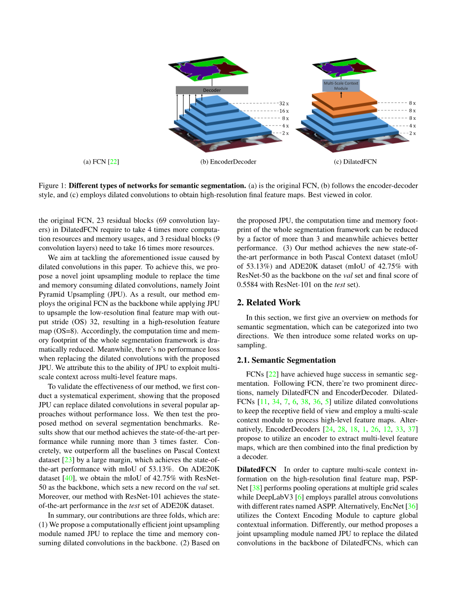 为了在高分辨率的最终特征图上捕获多尺度上下文信息,PSP- Net[38]在多个网格尺度上执行池操作,而DeepLabV3[6]采用不同速率的并行卷积命名为ASPP。另外,EncNet[36]利用上下文编码模块来捕获全局上下文信息。与之不同的是,我们的方法提出了一个联合的upsampling模块JPU来代替DilatedFCNs骨干中的扩张卷积在不损失性能的前提下,大大降低了计算复杂度。