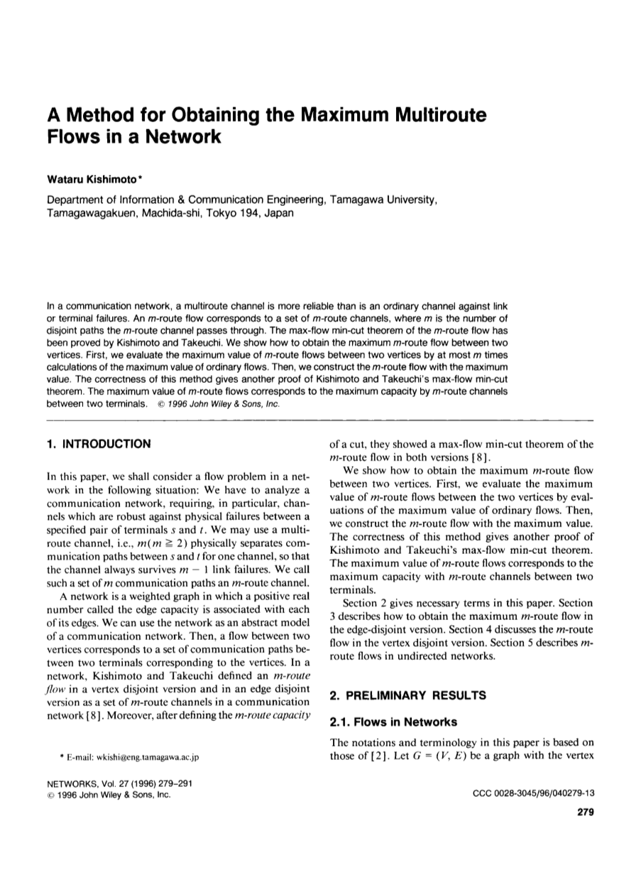 在通信网络中,多路径信道比普通信道在链路或终端故障方面更可靠。一个m路径流对应于一组m路径通道,其中m是它们所经过的不相交路径的数量。Kishimoto和Takeuchi证明了它们的最大流量最小割定理。我们展示了如何获得两个顶点之间的最大m路径流量。首先,我们通过计算普通流量最大值的m倍来求两个顶点之间的m路径流量的最大值。然后,构造出具有最大值的m路网络流。该方法的正确性为Kishimoto和Takeuchi的最大流最小割定理提供了另一个证明。m个路由流的最大值对应于两个终端之间的m个路由信道的最大容量。copy; 1996 John Wiley amp; Sons, Inc
