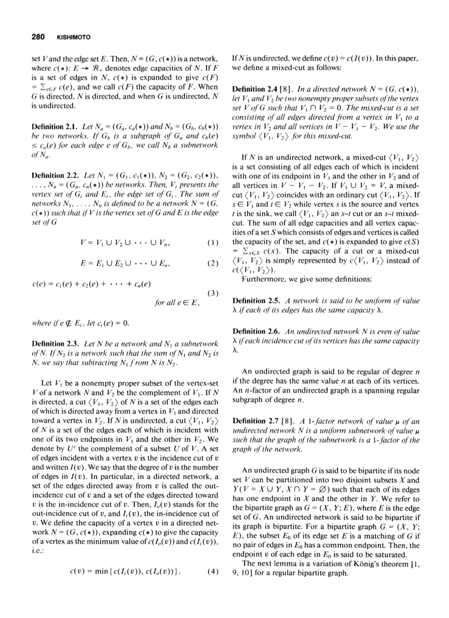 网络是一个加权图,其中一个称为边容量的正实数与其每条边相关联。我们可以把网络作为通信网络的抽象模型。然后,两个顶点之间的流对应于两个顶点对应的终端之间的一组通信路径。在网络中,Kishimoto和Takeuchi将顶点不相交版本的路径流和边不相交版本的路径流定义为通信网络中的一组路径通道[8]。此外,在定义了路由容量之后,对于一个切割,他们在两个版本中都展示了路径流的最大流最小切割定理[8]。