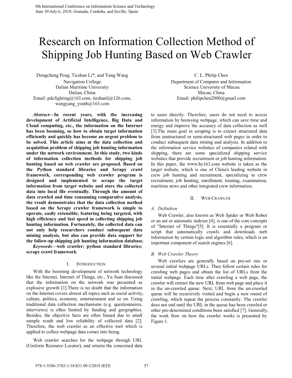to users directly. Therefore, users do not need to access information by browsing webpage, which can save time and energy and improve the accuracy of data collection as well [3].The main goal in scraping is to extract structured data from unstructured or semi-structured web pages in order to conduct subsequent data mining and analysis. In addition to the information service websites of companies related with shipping, there are some specialized shipping service websites that provide recruitment or job hunting information. In this paper, the www.hy163.com website is taken as the target website, which is one of Chinas leading website in crew job hunting and recruitment, specializing in crew recruitment, job hunting, enrollment, training, examination, maritime news and other integrated crew information.