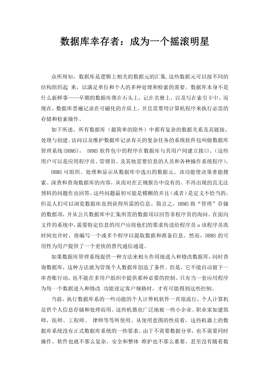 Yoursquo;ll see in the following pages that complex data relationships and linkages may be found in all but the simplest databases. The system software package that handles the difficult tasks associated with creating, accessing, and maintaining database records is called a database management system (DBMS) .The programs in a DBMS package establish an interface between the database itself and the users of the database. (These users may be applications programmers, managers and others with information needs, and various OS programs.)
